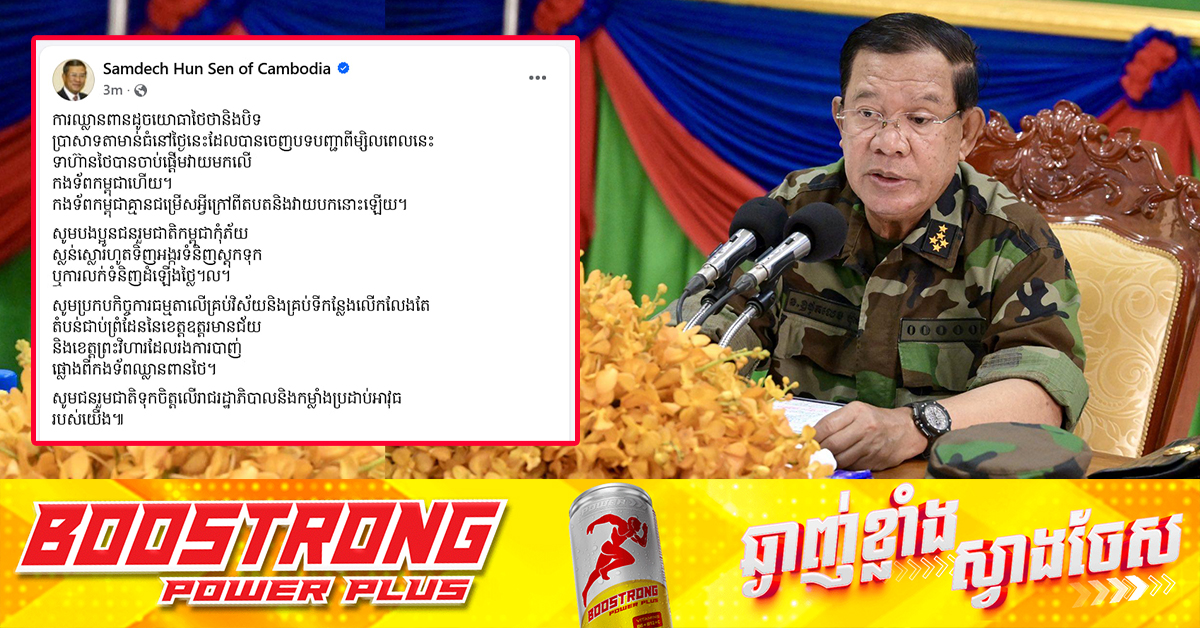 (ភ្នំពេញ)៖ សម្តេចតេជោ ហ៊ុន សែន បុរសខ្លាំងនៃកម្ពុជា បានចេញសារនៅព្រឹកថ្ងៃទី២៤ ខែកក្កដា ឆ្នាំ២០២៥នេះថា កងទ័ពកម្ពុជាគ្មានជម្រើសអ្វីក្រៅពីតបត និងវាយបកលើកងទ័ពឈានពានថៃ និងសូមបងប្អូនជនរួមជាតិកម្ពុជាកុំភ័យស្លន់ស្លោរហូតទិញអង្ករទំនិញស្តុកទុក ឬការលក់ទំនិញដំឡើងថ្លៃ។ សម្តេចតេជោ ហ៊ុន សែន បានបង្ហោះសារនៅលើបណ្តាញសង្គមយ៉ាងដូច្នេះថា៖ ការឈ្លានពានដូចយោធាថៃថា និងបិទប្រាសាទតាមាន់ធំនៅថ្ងៃនេះ ដែលបានចេញបទបញ្ជាពីម្សិលពេលនេះ ទាហានថៃបានចាប់ផ្តើមវាយមកលើកងទ័ពកម្ពុជាហើយ។ កងទ័ពកម្ពុជាគ្មានជម្រើសអ្វីក្រៅពីតបតនិងវាយបកនោះឡើយ។ សូមបងប្អូនជនរួមជាតិកម្ពុជាកុំភ័យស្លន់ស្លោរហូតទិញអង្ករទំនិញស្តុកទុក ឬការលក់ទំនិញដំឡើងថ្លៃ។ល។សូមប្រកបកិច្ចការធម្មតាលើគ្រប់វិស័យនិងគ្រប់ទីកន្លែងលើកលែងតែតំបន់ជាប់ព្រំដែននៃខេត្តឧត្តរមានជ័យនិងខេត្តព្រះវិហារដែលរងការបាញ់ផ្លោងពីកងទ័ពឈ្លានពានថៃ។សូមជនរួមជាតិទុកចិត្តលើរាជរដ្ឋាភិបាល និងកម្លាំងប្រដាប់អាវុធរបស់យើង៕ ផ្ដល់សិទ្ធិដោយ៖ Fresh News