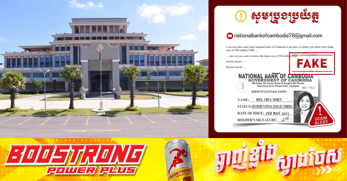 (ភ្នំពេញ)៖ ធនាគារជាតិនៃកម្ពុជា បានចេញសេចក្ដីជូនដំណឹងឲ្យមានការប្រុងប្រយ័ត្ន ដោយសារតែនាពេលថ្មីៗនេះ មានជនអនាមិកមួយចំនួន បានក្លែងបន្លំជាថ្នាក់ដឹកនាំ និងប្រើប្រាស់អាសយដ្ឋានអ៊ីម៉ែលក្លែងក្លាយ ក្រោមឈ្មោះធនាគារជាតិនៃកម្ពុជា ព្រមទាំងបណ្តាញសង្គមផ្សេងៗ ដើម្បីទាក់ទងទៅកាន់សាធារណជន ក្នុងចេតនាទុច្ចរិតដូចជា រៃអង្គាសប្រាក់ ផ្ទេរប្រាក់ ផ្សព្វផ្សាយពីគម្រោងវិនិយោគ ឬការទិញ-លក់ទំនិញ និងសេវាកម្មផ្សេងៗ។ តាមការជម្រាបជូនរបស់ធនាគារជាតិនៃកម្ពុជាបានឲ្យដឹងថា «ធនាគារជាតិនៃកម្ពុជា សូមបដិសេធទាំងស្រុង ចំពោះទង្វើរបស់បុគ្គលទុច្ចរិតទាំងនោះ និងសូមអំពាវនាវឱ្យសាធារណជនមេត្តាបង្កើនការប្រុងប្រយ័ត្នជាប់ជាប្រចាំ ដើម្បីកុំឱ្យធ្លាក់ចូលក្នុងល្បិចឆបោកណាមួយ ដែលអាចនាំឱ្យជាប់ពាក់ព័ន្ធនឹងទង្វើខុសច្បាប់ និងបាត់បង់ប្រាក់កាស ឬទ្រព្យសម្បត្តិផ្ទាល់ខ្លួន»។ អាស្រ័យដូចបានជម្រាបជូនខាងលើនេះ សូមសាធារណជនសហការជូនដំណឹងពាក់ព័ន្ធនឹងករណីបែបនេះ និងផ្ទៀងផ្ទាត់ព័ត៌មាន ជាមួយធនាគារជាតិនៃកម្ពុជាតាមរយៈទូរស័ព្ទ៖(៨៥៥) ២៣ ៩៩០ ១៩៦Email: nbccommunication@nbc.gov.kh ផ្ដល់សិទ្ធិដោយ៖ Fresh News