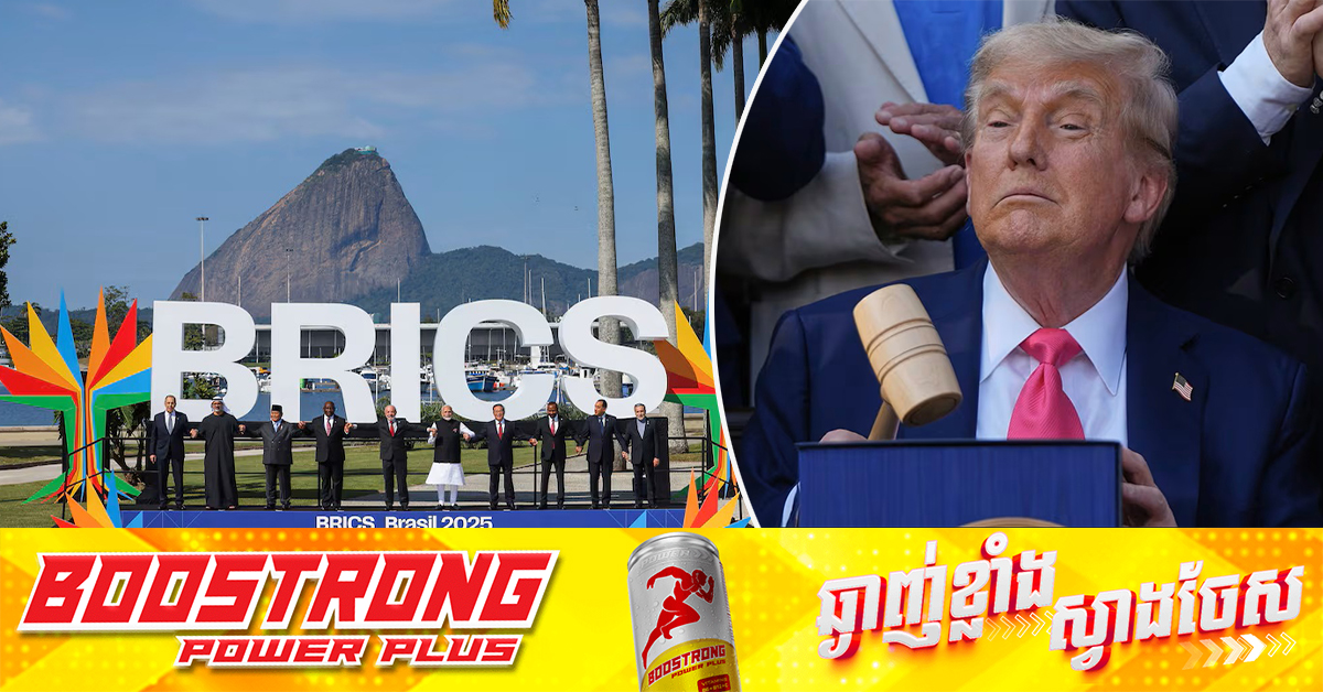 (វ៉ាស៊ីនតោន)៖ ប្រធានាធិបតីអាមេរិក លោក ដូណាល់ ត្រាំ បាននិយាយថាសហរដ្ឋអាមេរិកនឹងអនុវត្តការយកពន្ធគយបន្ថែម ១០ភាគរយលើទំនិញនាំចូល ពីក្រុមប្រទេស BRICS ក្នុងពេលឆាប់ៗ។ នេះបើតាមការចេញផ្សាយដោយទីភ្នាក់ងារសារព័ត៌មាន Reuters។ លោក ត្រាំ ដែលបានគំរាមយកពន្ធគយបន្ថែម១០ភាគរយកាលពីថ្ងៃអាទិត្យសប្ដាហ៍មុន បានលើកឡើងជាថ្មីនៅថ្ងៃអង្គារ ទី៨ ខែកក្កដា ក្នុងកិច្ចប្រជុំគណៈរដ្ឋមន្ត្រី នៅឯសេតវិមានថាការយកពន្ធគយនេះកំពុងដំណើរការទៅមុខ។ «ប្រទេសទាំងឡាយដែលស្ថិតនៅក្នុងអង្គការ BRICS នឹងត្រូវជាប់ពន្ធគយបន្ថែម១០ភាគរយ ក្នុងពេលឆាប់ៗ…ប្រសិនបើពួកគេជាសមាជិកមួយរបស់ BRICS នោះពួកគេនឹងត្រូវជាប់ពន្ធគយ១០ភាគរយ»។ គួរបញ្ជាក់ថា BRICS កាលពីឆ្នាំ២០២៤ បានពង្រីកសមាជិកបន្ថែមក្រៅពីប្រេស៊ីល រុស្ស៉ី ឥណ្ឌា ចិន និងអាហ្វ្រិកខាងត្បូង ក្នុងនោះមានដូចជាអ៉ីរ៉ង់ និងឥណ្ឌូណេស៊ីជាដើម៕
