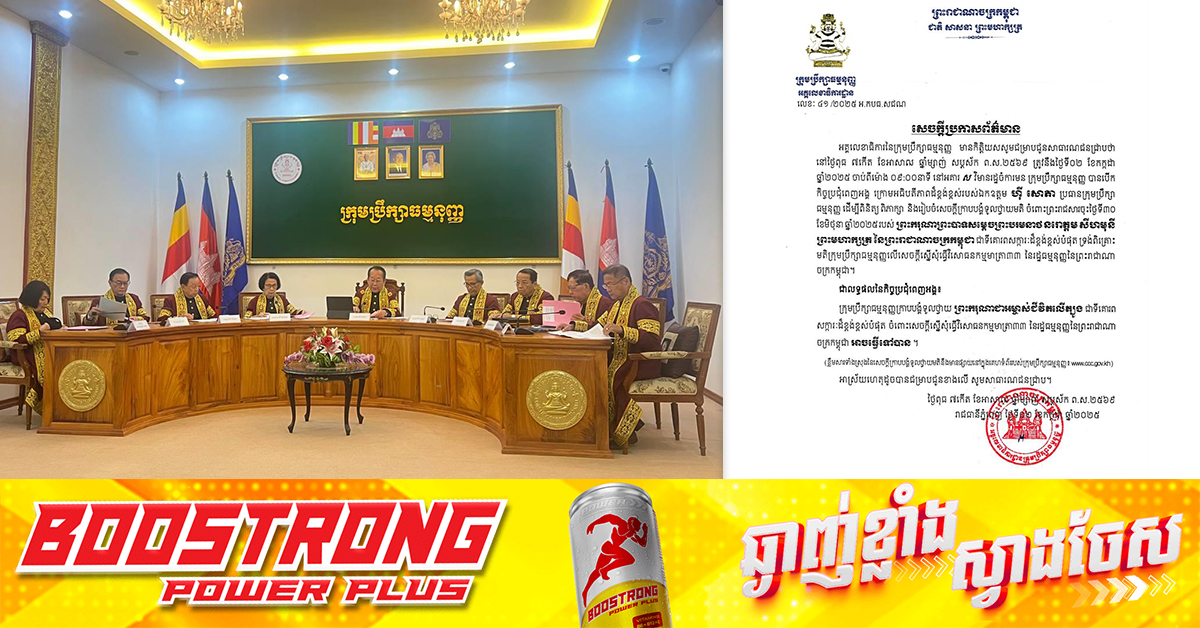 (ភ្នំពេញ)៖ ក្រុមប្រឹក្សាធម្មនុញ្ញ នៅថ្ងៃទី០២ ខែកក្កដា ឆ្នាំ២០២៥ បានបើកកិច្ចប្រជុំពេញអង្គក្រោមអធិបតីភាពលោក ហ៉ី សោភា ប្រធានក្រុមប្រឹក្សាធម្មនុញ្ញ ដើម្បីពិនិត្យ ពិភាក្សា និងរៀបចំសេចក្តីក្រាបបង្គំទូលថ្វាយមតិចំពោះព្រះរាជសារចុះថ្ងៃទី៣០ ខែមិថុនា ឆ្នាំ២០២៥ របស់ ព្រះករុណា ព្រះបាទសម្តេច ព្រះបរមនាថ នរោត្តម សីហមុនី ព្រះមហាក្សត្រកម្ពុជា ជាទីគោរពសក្ការៈដ៏ខ្ពង់ខ្ពស់បំផុត ទ្រង់ពិគ្រោះ មតិក្រុមប្រឹក្សាធម្មនុញ្ញ លើសេចក្តីស្នើសុំធ្វើវិសោធនកម្មមាត្រា៣៣ នៃរដ្ឋធម្មនុញ្ញកម្ពុជា។ ជាលទ្ធផលនៃកិច្ចប្រជុំពេញអង្គ ក្រុមប្រឹក្សាធម្មនុញ្ញក្រាបបង្គំទូលថ្វាយព្រះករុណា ជាអម្ចាស់ជីវិតលើត្បូង ជាទីគោរពសក្ការៈដ៏ខ្ពង់ខ្ពស់បំផុត ចំពោះសេចក្តីស្នើសុំធ្វើវិសោធនកម្មមាត្រា៣៣ នៃរដ្ឋធម្មនុញ្ញកម្ពុជា អាចធ្វើទៅបាន។ សូមជម្រាបថា សម្តេចអគ្គមហាសេនាបតីតេជោ