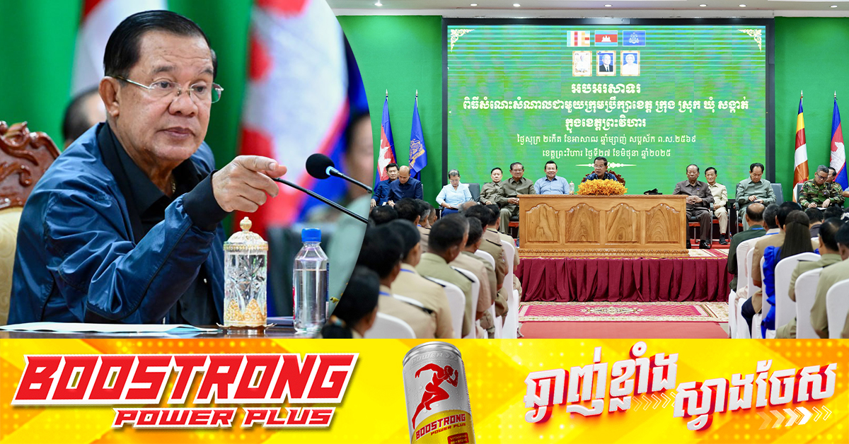 (ព្រះវិហារ)៖ បុរសខ្លាំងនៅកម្ពុជា សម្តេចតេជោ ហ៊ុន សែន នាយឧត្តមសេនីយ៍ផុតលេខផ្កាយមាស៥ ប្រធានព្រឹទ្ធសភា បានព្រមានយ៉ាងធ្ងន់ៗថា ប្រទេសកម្ពុជា មានសិទ្ធិការពារខ្លួន និងមានសិទ្ធិវាយបកទៅលើខ្មាំងសត្រូវដែលមានមហិច្ឆតាឈ្លានពានទឹកដីកម្ពុជា បើទោះបីកម្ពុជា មានសព្វាវុធ អាចបាញ់ដល់ទីក្រុងបាងកក ក៏ប៉ុន្តែកម្ពុជា មិនធ្វើបែបនេះទេកម្ពុជាសុំត្រឹមតែការពារជាតិ ទប់ទល់ និងវាយបកសត្រូវដែលមានមហិច្ឆតាឈ្លានពានចូលដីខ្មែរតែប៉ុណ្ណោះ។ ការបញ្ជាក់បែបនេះរបស់សម្តេចតេជោ ហ៊ុន សែន បានធ្វើឡើងនៅក្នុងឱកាសអញ្ជើញជួបសំណេះសំណាលជាមួយសមាជិកក្រុមប្រឹក្សាឃុំ-សង្កាត់ ស្រុក-ក្រុង ខេត្តព្រះវិហារចំនួន ៤៤៦នាក់ នៅសាលាខេត្តព្រះវិហារ នាព្រឹកថ្ងៃទី២៧ ខែមិថុនា ឆ្នាំ២០២៥នេះ។ ពាក់ព័ន្ធនឹងជម្លោះព្រំដែនរវាងកម្ពុជា និងថៃ, ត្រូវសម្តេចតេជោ ហ៊ុន សែន បានបញ្ជាក់ថា