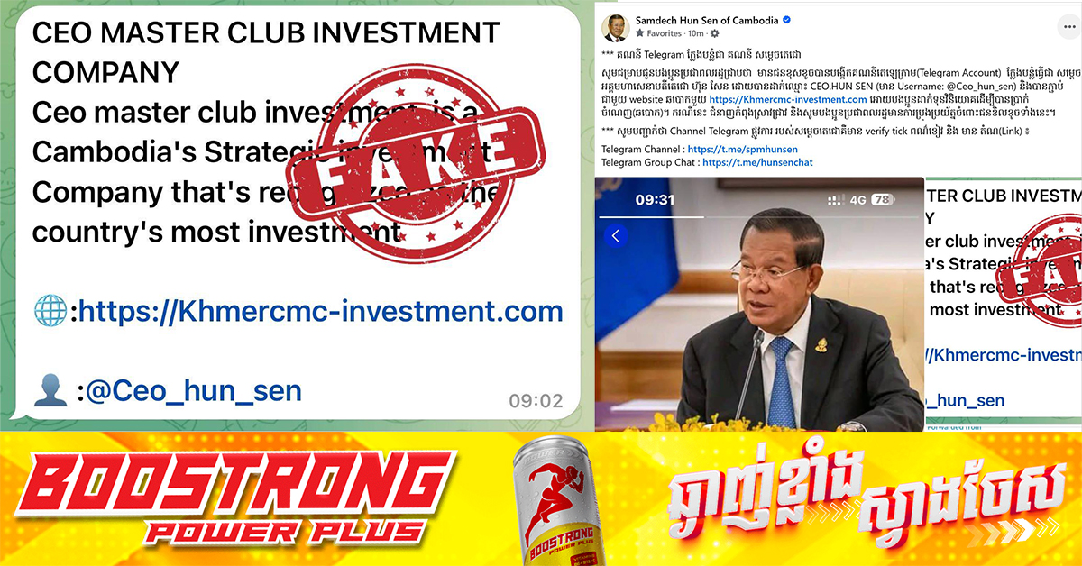 (ភ្នំពេញ)៖ ជនខិលខូចក្លែងបន្លំធ្វើជាគណនី Telegram របស់សម្តេចតេជោ ហ៊ុន សែន មានដោយបានដាក់ឈ្មោះ CEO.HUN SEN (មាន Username: @Ceo_hun_sen) និងបានភ្ជាប់ជាមួយ website ឆបោកមួយ https://Khmercmc-investment.com អោយបងប្អូនដាក់ទុនវិនិយោគដើម្បីបានប្រាក់ចំណេញ(ឆបោក)។ ករណីនេះជំនាញកំពុងស្រាវជ្រាវ និងសូមបងប្អូនប្រជាពលរដ្ឋមានការប្រុងប្រយ័ត្នចំពោះជនខិលខូចទាំងនេះ៕ ផ្ដល់សិទ្ធិដោយ៖ Fresh News
