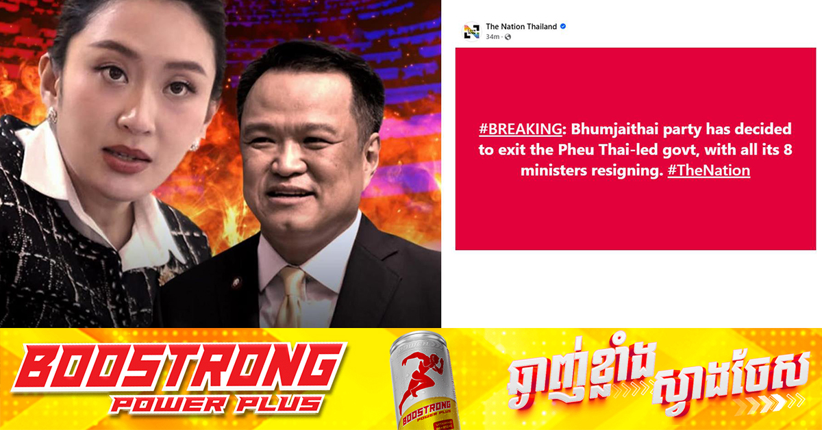 (បាងកក)៖ គណបក្ស Bhumjaithai នៅថ្ងៃពុធ ទី១៨ ខែមិថុនា បានប្រកាសពីការដើរចេញពីរដ្ឋាភិបាលចម្រុះដឹកនាំដោយគណបក្ស Pheu Thai ភ្ជាប់ជាមួយការអំពាវនាវឱ្យនាយករដ្ឋមន្ត្រី លោកស្រី Paetongtarn Shinawatra ទទួលខុសត្រូវលើកិច្ចសន្ទនាតាមទូរស័ព្ទជាមួយប្រធានព្រឹទ្ធសភាកម្ពុជា សម្ដេចតេជោ ហ៊ុន សែន ដែលបានបែកធ្លាយ។ នេះបើតាមការចេញផ្សាយដោយកាសែតថៃ The Nation។ នៅក្នុងសេចក្ដីថ្លែងការណ៍របស់ខ្លួន គណបក្ស Bhumjaithai បានលើកឡើងថាកិច្ចសន្ទនាតាមទូរស័ព្ទរវាងលោកស្រី Paetongtarn និងសម្ដេចតេជោ ហ៊ុន សែន បានបង្កផលប៉ះពាល់ដល់អធិបតេយ្យ បូរណភាពទឹកដីរបស់ថៃ និងយោធាថៃ។ សេចក្ដីថ្លែងការណ៍ដដែល បានឱ្យដឹងទៀតថា គណៈកម្មាធិការប្រតិបត្តិរបស់បក្សបានកោះប្រជុំជជែកពិភាក្សាពីបញ្ហា