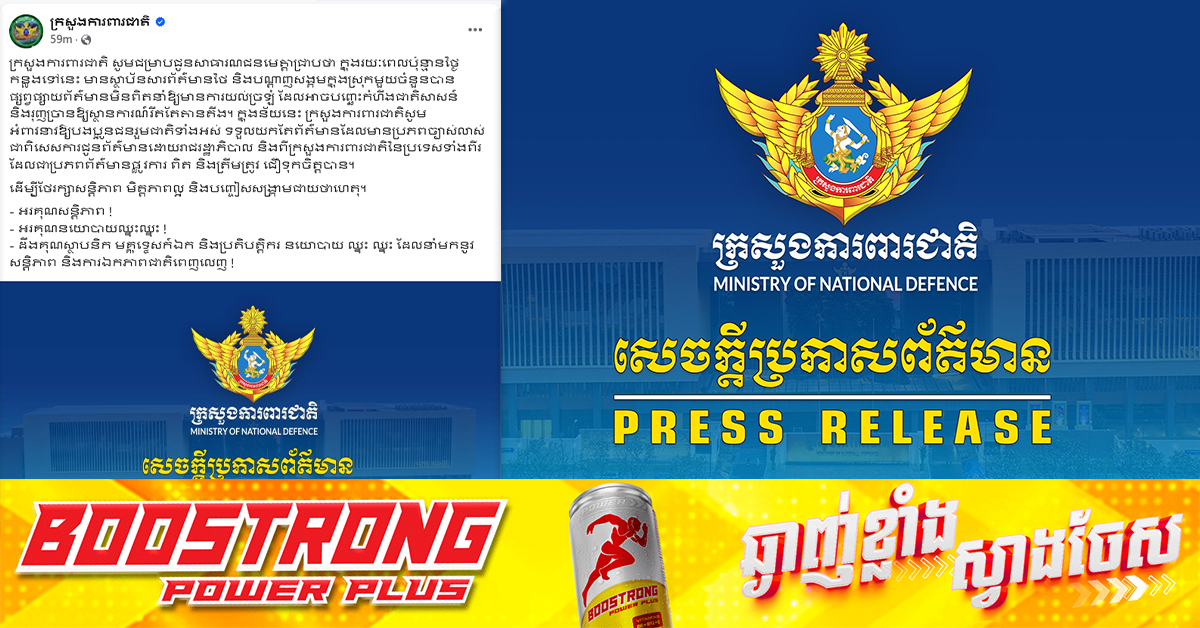 (ភ្នំពេញ)៖ ខណៈដែលការប្រឈមគ្នារវាងកម្ពុជា-ថៃ ក្លាយជាប្រធានបទក្តៅនាពេលនេះ ក្រសួងការពារជាតិកម្ពុជា បានរកឃើញថា សារព័ត៌មានថៃ និងបណ្តាញសង្គមមួយចំនួន បានផ្សព្វផ្សាយព័ត៌មានមិនពិត បង្កឱ្យមានការភាន់ច្រឡំពាក់ព័ន្ធស្ថានភាពកងទ័ព។ ជុំវិញបញ្ហានេះ ក្រសួងការពារជាតិកម្ពុជា បានអំពាវនាវដល់ជនរួមជាតិទាំងអស់ កុំឱ្យជឿតាមការផ្សព្វផ្សាយតាមសារព័ត៌មានថៃ និងបណ្តាញសង្គមទាំងនោះ ហើយរង់ចាំទទួលយកតែព័ត៌មានផ្លូវការ ដែលផ្សព្វផ្សាយដោយក្រសួងការពារជាតិ និងរាជរដ្ឋាភិបាលកម្ពុជា តាមរយៈបណ្តាញសង្គមនានារបស់ខ្លួន ក្រសួងការពារជាតិកម្ពុជា នៅថ្ងៃទី០៩ ខែមិថុនា ឆ្នាំ២០២៥នេះ បានអះអាងថា «ក្នុងរយៈពេលប៉ុន្មានថ្ងៃកន្លងទៅនេះ មានស្ថាប័នសារព័ត៌មានថៃ និងបណ្តាញសង្គមក្នុងស្រុកមួយចំនួនបានផ្សព្វផ្សាយព័ត៌មានមិនពិតនាំឱ្យមានការយល់ច្រឡំ ដែលអាចបញ្ឆេះកំហឹងជាតិសាសន៍ និងរុញច្រានឱ្យស្ថានការណ៍រឹតតែតានតឹង។ ក្នុងន័យនេះ ក្រសួងការពារជាតិ សូមអំពាវនាវឱ្យបងប្អូនជនរួមជាតិទាំងអស់ ទទួលយកតែព័ត៌មានដែលមានប្រភពច្បាស់លាស់ ជាពិសេសការជូនព័ត៌មានដោយរាជរដ្ឋាភិបាល និងពីក្រសួងការពារជាតិនៃប្រទេសទាំងពីរ ដែលជាប្រភពព័ត៌មានផ្លូវការ ពិត