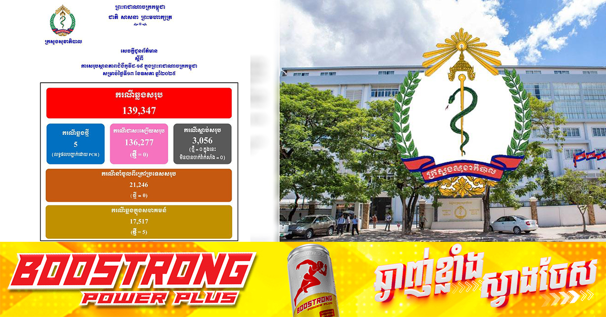 (ភ្នំពេញ)៖ ក្រសួងសុខាភិបាល នៅថ្ងៃទី១៤ ខែឧសភាឆ្នាំ២០២៥នេះ បានចេញសេចក្តីប្រកាសព័ត៌មាន បញ្ជាក់ពីការរកឃើញអ្នកឆ្លងកូវីដ១៩ចំនួន ៥នាក់ ខណៈជាអ្នកជាសះស្បើយគ្មាន។ សូមជម្រាបថា គិតត្រឹមការប្រកាសរបស់ក្រសួងសុខាភិបាល ថ្ងៃទី១៤ ខែឧសភា ឆ្នាំ២០២៥ កម្ពុជារកឃើញអ្នកឆ្លងជំងឺកូវីដ១៩៖ សរុបចំនួន១៣៩,៣៤៧នាក់, អ្នកជាសះស្បើយសរុបចំនួន ១៣៦,២៧៧នាក់, ស្លាប់សរុបចំនួន ៣,០៥៦នាក់៕ ផ្ដល់សិទ្ធិដោយ៖ Fresh News