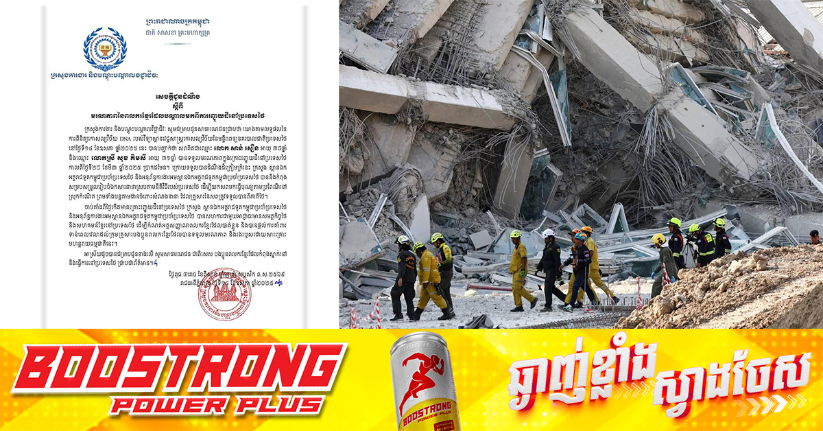 (ភ្នំពេញ)៖ ក្រសួងការងារ និងបណ្តុះបណ្តាលវិជ្ជាជីវៈ នៅថ្ងៃទី១៤ ខែឧសភា ឆ្នាំ២០២៥ បានចេញសេចក្តីជូនដំណឹងស្តីពី មរណភាពនៃពលករខ្មែរដែលបណ្តាលមកពីការរញ្ជួយដីនៅប្រទេសថៃ។ នេះបើយោងតាមសេចក្តីជូនដំណឹង ដែលបណ្ដាញសារព័ត៌មាន Fresh news ទទួលបាន។ ក្រសួងបានបញ្ជាក់ថា យោងតាមលទ្ធផលនៃ ការពិនិត្យកោសល្យវិច័យ DNA របស់វិទ្យាស្ថានវេជ្ជសាស្ត្រកោសល្យវិច័យនៃមន្ទីរពេទ្យនគរបាលជាតិប្រទេសថៃ នៅថ្ងៃទី១៤ ខែឧសភា ឆ្នាំ២០២៥ នេះ បានបញ្ជាក់ថា សពពិតជាឈ្មោះ លោក សាន់ សឿន អាយុ ៣៨ឆ្នាំ និងឈ្មោះ លោកស្រី សុខ គឹមសី អាយុ ៣១ឆ្នាំ