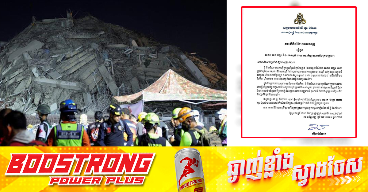 (ភ្នំពេញ)៖ សម្ដេចបវរធិបតី ហ៊ុន ម៉ាណែត នាយករដ្ឋមន្ត្រីនៃកម្ពុជា បានសារលិខិតរំលែកមរណទុក្ខផ្ញើជូន លោក សៅ ផល្លា និងលោកស្រី ឆាយ សោភ័ណ្ឌ ព្រមទាំងក្រុមគ្រួសារ ចំពោះមរណភាពរបស់ លោក ផល្លា រតនា ត្រូវជាកូនរបស់ លោក និងលោកស្រី ដែលបានទទួលមរណភាពក្នុងអាយុ ២៤ឆ្នាំ នៅក្នុងគ្រោះរញ្ជួយដី នៅប្រទេសថៃ កាលពីថ្ងៃទី២៨ ខែមីនា ឆ្នាំ២០២៥ ខណៈកំពុងស្នាក់នៅ និងធ្វើការនៅប្រទេសថៃ។ សូមជម្រាបថា ក្រសួងការងារ និងបណ្តុះបណ្តាលវិជ្ជាជីវៈ នៅថ្ងៃទី១៧ ខែមេសា ឆ្នាំ២០២៥