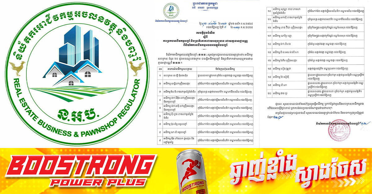(ភ្នំពេញ)៖ និយ័តករអាជីវកម្មអចលនវត្ថុនិងបញ្ចាំ បានចេញសេចក្តីជូនដំណឹង ស្តីពីការប្រកបអាជីវកម្មបញ្ចាំ និងប្រាតិភោគដោយអនុប្បទាន ដោយគ្មានអាជ្ញាបណ្ណពីនិយ័តករអាជីវកម្មអចលនវត្ថុ និងបញ្ចាំ។ ខាងក្រោមនេះជាបញ្ជីរាយនាមអាជីវកម្មទាំង ២០៖ ផ្ដល់សិទ្ធិដោយ៖ Fresh News