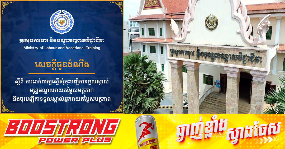 (ភ្នំពេញ)៖ ក្រសួងការងារ និងបណ្ដុះបណ្ដាលវិជ្ជាជីវៈ បានចេញសេចក្តីជូនដំណឹង ស្តីពី ការដាក់ពាក្យស្នើសុំចុះបញ្ជិកាទទួលស្គាល់ មជ្ឈមណ្ឌលវាយតម្លៃសមត្ថភាព និងចុះបញ្ជិកាទទួលស្គាល់អ្នកវាយតម្លៃសមត្ថភាព។ នេះបើតាមសេចក្ដីជូនដំណឹង ដែលបណ្ដាញព័ត៌មាន Fresh News ទទួលបាននៅថ្ងៃទី០២ ខែមេសា ឆ្នាំ២០២៥៕ ខាងក្រោមនេះ ជាសេចក្ដីជូនដំណឹង ដែលមានខ្លឹមសារទាំងស្រុង៖ ផ្ដល់សិទ្ធិដោយ៖ Fresh News
