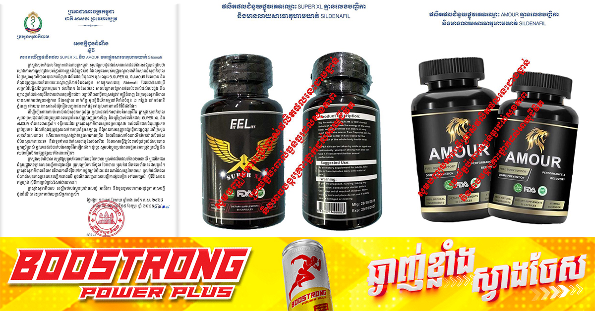 (ភ្នំពេញ)៖ ក្រសួងសុខាភិបាល នៅថ្ងៃទី២៥ ខែកុម្ភៈ ឆ្នាំ២០២៥នេះ បានចេញសេចក្តីជូនដំណឹង ស្តីពីការរកឃើញផលិតផល SUPER XL និង AMOUR មានផ្ទុកសារធាតុហាមឃាត់ Sildenafil។ បើតាមក្រសួងសុខាភិបាល សារធាតុហាមឃាត់ Sildenafil អាចប៉ះពាល់ដល់សុខភាពធ្ងន់ធ្ងរ ឈានដល់ការបាត់បង់ជីវិតទៀតផង៕ ខាងក្រោមនេះជាសេចក្តីជូនដំណឹង របស់ក្រសួងសុខាភិបាល៖ ផ្ដល់សិទ្ធិដោយ៖ Fresh News