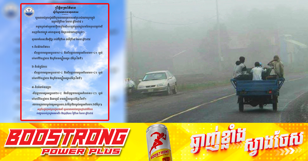 (ភ្នំពេញ)៖ ក្រសួងធនធានទឹក និងឧតុនិយម បានចេញសេចក្តីជូនដំណឹង អំពីស្ថានភាពធាតុអាកាសនៅកម្ពុជា សម្រាប់ថ្ងៃទី១៣ ខែមករា ឆ្នាំ២០២៥។ ខាងក្រោមនេះ ជាសេចក្តីជូនដំណឹងរបស់ក្រសួងធនធានទឹក៖ ផ្ដល់សិទ្ធិដោយ៖ Fresh News