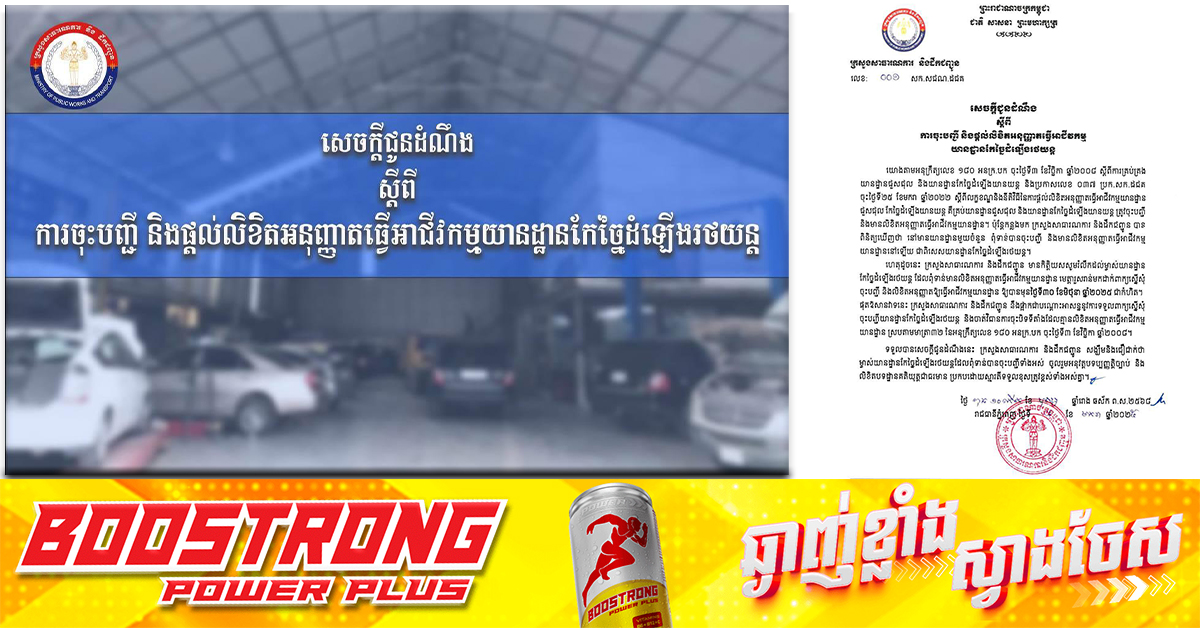 (ភ្នំពេញ)៖ ក្រោយបានពិនិត្យឃើញថានៅមានយានដ្ឋានមួយចំនួនពុំទាន់បានចុះបញ្ជី និងមានលិខិតអនុញ្ញាតធ្វើអាជីវកម្មយានដ្ឋាននៅឡើយ ជាពិសេសយានដ្ឋានកែច្នៃដំឡើងរថយន្ត ក្រសួងសាធារណការ និងដឹកជញ្ជូន បានចេញសេចក្តីជូនដំណឹងរំលឹកដល់ម្ចាស់យានដ្ឋានកែច្នៃដំឡើងរថយន្ត ដែលពុំទាន់មានលិខិតអនុញ្ញាតធ្វើអាជីវកម្មយានដ្ឋាន មេត្តារួសរាន់មកដាក់ពាក្យស្នើសុំចុះបញ្ជីនិងលិខិតអនុញ្ញាតឱ្យធ្វើអាជីវកម្មយានដ្ឋាន ឱ្យបានមុនថ្ងៃទី៣០ ខែមិថុនា ឆ្នាំ២០២៥ ជាកំហិត។ នៅក្នុងសេចក្តីជូនដំណឹងរបស់ក្រសួងសាធារណការ និងដឹកជញ្ជូន ដែលបណ្តាញព័ត៌មាន Fresh News ទទួលបាននៅថ្ងៃទី០៩ ខែមករា ឆ្នាំ២០២៥នេះ បានឱ្យដឹងទៀតថា បើផុតឱសានវាទនេះ ក្រសួងនឹងផ្អាកជាបណ្តោះអាសន្ននូវការទទួលពាក្យស្នើសុំ ចុះបញ្ជីយានដ្ឋានកែច្នៃដំឡើងរថយន្ត និងចាត់វិធានការចុះបិទទីតាំងដែលគ្មានលិខិតអនុញ្ញាតធ្វើអាជីវកម្ម យានដ្ឋាន ស្របតាមមាត្រា៣២ នៃអនុក្រឹត្យលេខ ១៨០ អនក្រ.បក ចុះថ្ងៃទី៣ ខែវិច្ឆិកា ឆ្នាំ២០០៨។ ទទួលបានសេចក្តីជូនដំណឹងនេះក្រសួង