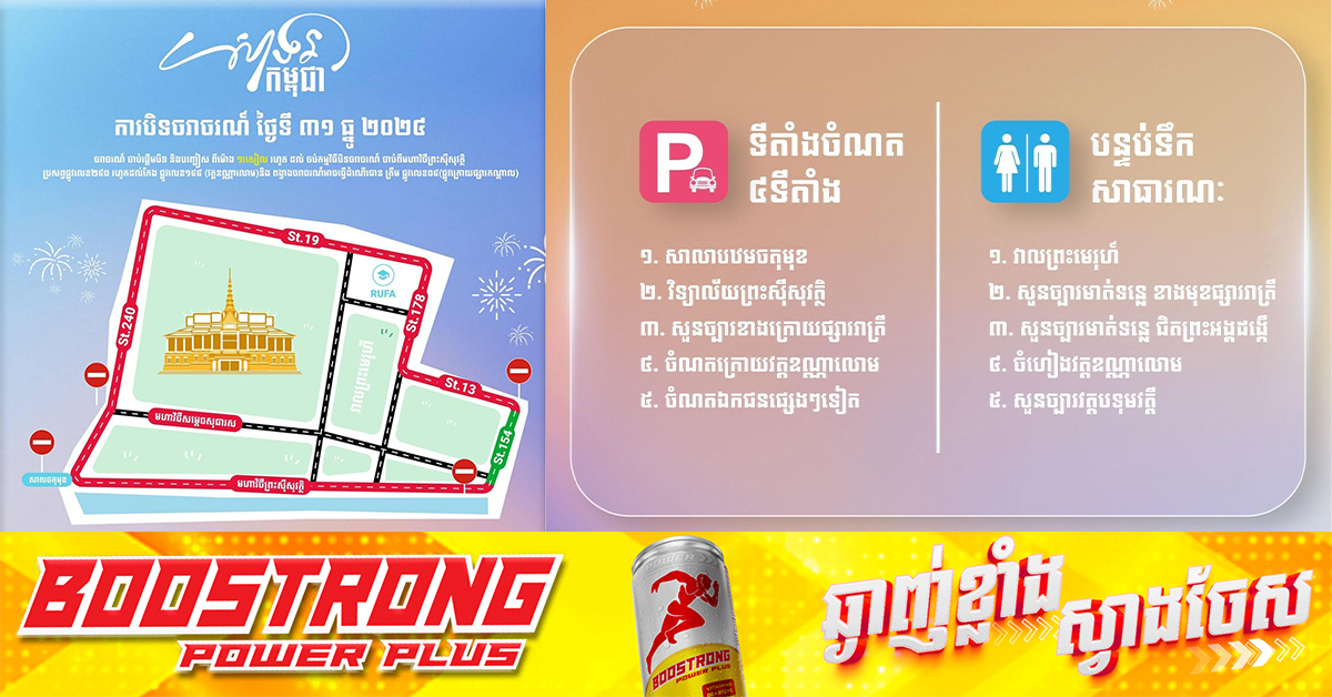 (ភ្នំពេញ)៖ ព្រឹត្តិការណ៍ «សាទរកម្ពុជា» ចាប់ផ្ដើមប្រព្រឹត្តទៅនៅរសៀលថ្ងៃទី៣១ ខែធ្នូ ឆ្នាំ២០២៤នេះ រហូតដល់យប់រំលងអធ្រាត្រឈានចូលថ្ងៃទី១ ខែមករា ឆ្នាំ២០២៥ នាសួនច្បារមុខព្រះមរបរាជវាំង និងបណ្ដោយតីរវិថីព្រះស៉ីសុវត្ថិ។ ជាមួយគ្នានេះ ក្រុមការងាររៀបចំ ក៏បានបង្ហាញនូវទីតាំងចំណតយានយន្ដ និងទីតាំងបន្ទប់សាធារណៈសម្រាប់ប្រជាពលរដ្ឋងាយស្រួលក្នុងការស្វែងរកផងដែរ។ ព្រឹត្តិការណ៍ «សាទរកម្ពុជា» ដែលជាក្បួនដង្ហែដ៏ធំពុំធ្លាប់មាន ល្បែងកម្សាន្តសប្បាយៗជាច្រើនកន្លែង ការសម្តែងសិល្បៈចម្រុះពីសិល្បករល្បីៗជាច្រើន ការតុបតែងលម្អស្អាតៗ រួមជាមួយនឹងការបាញ់កាំជ្រួចរាប់ថយក្រោយឆ្លងឆ្នាំសកល២០២៤ ចូលទៅកាន់២០២៥ នឹងចូលមកដល់ហើយ។ ព្រឹត្តិការណ៍ «សាទរកម្ពុជា» មានកម្មវិធីដ៏គួឲ្យរំភើបជាច្រើនដូចជា ក្បួនដង្ហែដែលមានអ្នកចូលរួមប្រមាណ ៣០០០នាក់។ សូមកុំភ្លេចចូលរួមទាំងអស់គ្នា នៅថ្ងៃទី៣១ ខែធ្នូ ឆ្នាំ២០២៤ នៅសួនច្បារមុខព្រះបរមរាជវាំង ចាប់ពីវេលាម៉ោង៣៖០០រសៀល