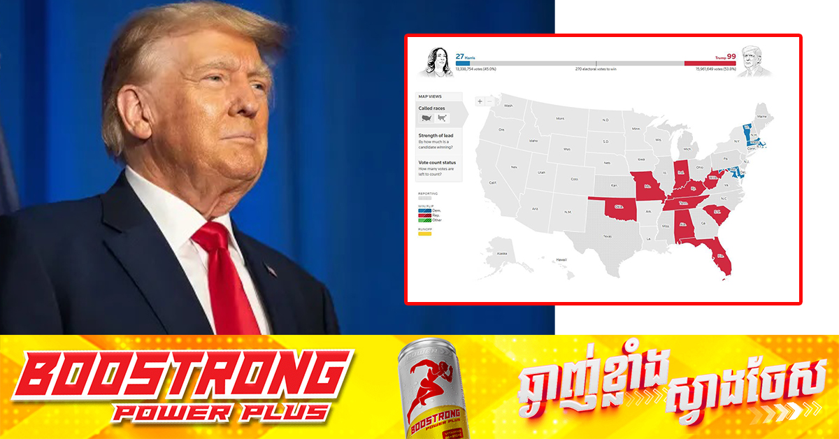 (វ៉ាស៊ីនតោន)៖ បេក្ខជនប្រធានាធិបតី មកពីគណបក្សសាធារណរដ្ឋ លោក ដូណាល់ ត្រាំ កំពុងនាំមុខលោកស្រី កាម៉ាឡា ហារីស ជាបេក្ខជនប្រធានាធិបតី នៃគណបក្សប្រជាធិបតេយ្យ ដោយទទួលបានអង្គបោះឆ្នោត ១៧៨ ទល់នឹង៩៩។ នេះបើតាមសារព័ត៌មាន New York Times។ ដើម្បីអាចក្លាយជាប្រធានាធិបតីអាមេរិក លោកស្រី ហារីស ឬលោក ត្រាំ ត្រូវប្រមូលឱ្យបានអង្គបោះឆ្នោតយ៉ាងហោច ២៧០រូប ក្នុងចំណោមអង្គបោះឆ្នោតសរុប ៥៣៨រូប។ ប៉ុន្តែលទ្ធផលបោះឆ្នោតត្រឹមម៉ោងនេះ មិនមែនជារឿងភ្ញាក់ផ្អើលនោះទេ ដ្បិតរដ្ឋដែលលោក ត្រាំ ឬលោកស្រី ហារីស បានឈ្នះគឺជារដ្ឋដែលមានប្រពៃណីបោះឆ្នោតឱ្យគណបក្សសាធារណរដ្ឋ រហូត