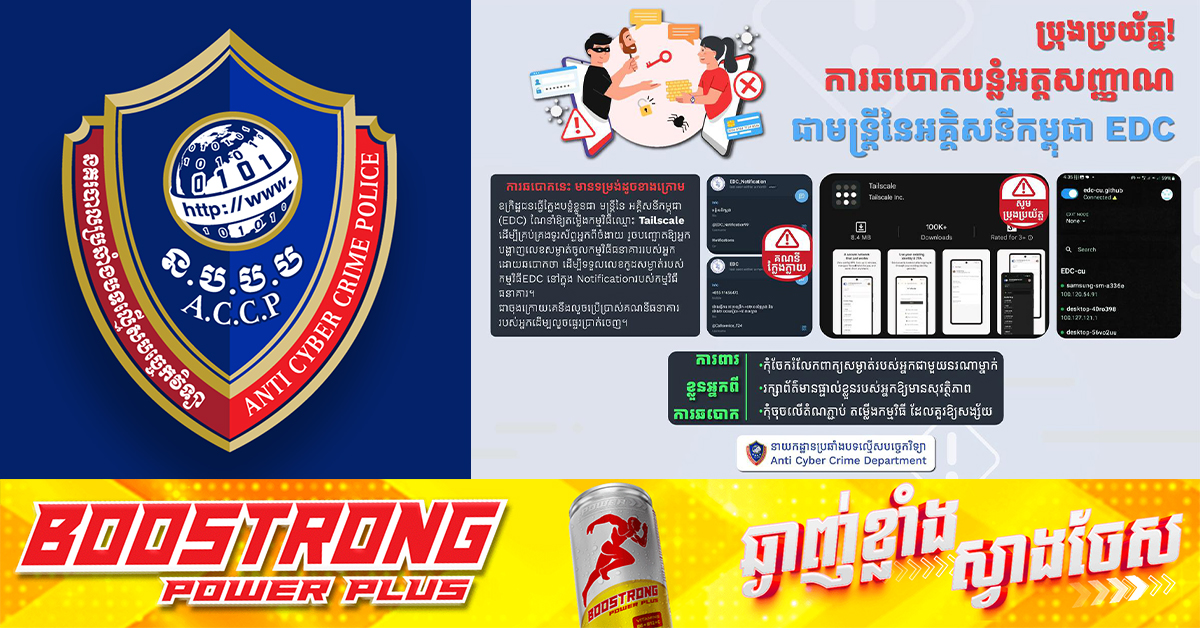(ភ្នំពេញ)៖ នាយកដ្ឋានប្រឆាំងបទល្មើសបច្ចេកវិទ្យា បានឱ្យដឹងថា ពេលថ្មីៗនេះ មានការឆបោកក្រោមរូបភាពបន្លំខ្លួនជា មន្ត្រី នៃអគ្គីសនីកម្ពុជា (EDC) ហើយទាក់ទងមកជនរងគ្រោះ និងណែនាំឱ្យជនរងគ្រោះតម្លើងកម្មវិធី EDC ដើម្បីទាញយកទំនុកចិត្តពីជនរងគ្រោះ បន្ទាប់មកណែនាំឱ្យតម្លើងកម្មវិធីឈ្មោះ Tailscale ដើម្បីគ្រប់គ្រងទូរស័ព្ទពីចំងាយ រួចបញ្ឆោតឱ្យជនរងគ្រោះ បង្ហាញលេខសម្ងាត់ចូលកម្មវិធីធនាគារ ដោយឆបោកថា ដើម្បីទទួលលេខកូដសម្ងាត់របស់កម្មវិធី EDC នៅក្នុង Notification របស់កម្មវិធីធនាគារ។ ជាចុងក្រោយគេនឹងលួចប្រើប្រាស់គណនីធនាគាររបស់ជនរងគ្រោះដើម្បីលួចផ្ទេរប្រាក់ចេញ។ នាយកដ្ឋានប្រឆាំងបទល្មើសបច្ចេកវិទ្យា សូមក្រើនរំលឹកដល់សាធារណជនទាំងអស់ មេត្តាគប្បីប្រុងប្រយ័ត្ន ដូចខាងក្រោម៖ * ផ្ទៀងផ្ទាត់៖ ប្រសិនបើអ្នកទទួលបានសារ ឬការហៅទូរស័ព្ទដែលមិនព្រាងទុក សូមបញ្ជាក់ពីអត្តសញ្ញាណរបស់បុគ្គលតាមរយៈប្រភពពិតប្រាកដជាមុនសិន។ * កុំប្រញាប់៖