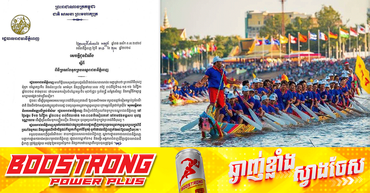(ភ្នំពេញ)៖ រដ្ឋបាលរាជធានីភ្នំពេញ បានជូនដំណឹងថា ព្រះរាជពិធីបុណ្យ អុំទូក បណ្តែតប្រទីប និងសំពះព្រះខែ អកអំបុក នឹងប្រព្រឹត្តទៅរយៈពេល ៣ថ្ងៃ ចាប់ពីថ្ងៃទី១៤-១៥-១៦ ខែវិច្ឆិកា ឆ្នាំ២០២៤ ខាងមុខនេះ នឹងមានការរៀបចំបណ្តែតប្រទីប អុជកាំជ្រួច ប្រគំតន្ត្រី សម្តែងសិល្បៈ និងកម្មវិធីកម្សាន្ត សប្បាយផ្សេងៗជាច្រើនទៀត។ ដូចនេះ ដើម្បីចូលរួមអបអរសាទរព្រះរាជពិធីបុណ្យខាងលើ ឱ្យបានអធិកអធម រក្សាបាននូវទំនៀមទម្លាប់ប្រពៃណីជាតិ និងបើកឱកាសជូនបងប្អូនប្រជាពលរដ្ឋ បានចូលរួមទស្សនាកម្សាន្តសប្បាយ ក្រោមម្លប់ដ៏ត្រជាក់ត្រជុំនៃ «សុខសន្តិភាព និងការអភិវឌ្ឍលើគ្រប់វិស័យ» រដ្ឋបាលរាជធានីភ្នំពេញ នឹងរៀបចំពិធីប្រណាំងទូកក្របខណ្ឌរាជធានីភ្នំពេញ នៅថ្ងៃអង្គារ ទី១២ ខែវិច្ឆិកា ឆ្នាំ២០២៤ ចាប់ពីវេលាម៉ោង ១៣:០០នាទីរសៀលតទៅ