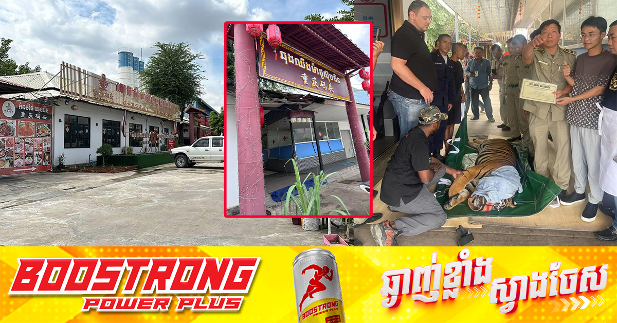 (ភ្នំពេញ)៖ ក្រមការងារអភិរក្សសត្វព្រៃ និងកម្លាំងកងរាជអាវុធហត្ថ នៅព្រឹកថ្ងៃទី២៩ ខែតុលា ឆ្នាំ២០៤នេះ បានចុះមកស្នើសុំដើម្បីយកសត្វខ្លាដំបង ១ក្បាល ដែលជនជាតិចិន នៅចំណុចភោជនីយដ្ឋាន ឆុងឈីងម៉ាថូស៊ុបចិន តាមផ្លូវជាតិលេខ១ សង្កាត់និរោធ ខណ្ឌច្បារអំពៅ ចិញ្ចឹមតាំងពីតូច ដើម្បីនាំទៅលែងនៅក្នុងទ្រុង ស្ថិតក្នុងឧទ្យានសួនសត្វ ព្រៃការពារ និងសួនភូតគាម «ភ្នំតាម៉ៅ» វិញ។ យោងតាមអាជ្ញាធរមូលដ្ឋានបានឱ្យដឹងថា «ក្រុមការងារអភិរក្សសត្វព្រៃសួនសត្វភ្នំតាម៉ៅ មកយកសត្វខ្លាដែលបុរសជនជាតិចិនចិញ្ចឹម នៅក្នុងភោជនីយដ្ឋានខាងលើដោយបានទទួលព័ត៌មាន ហើយអាជ្ញាធរថា គាត់មិនបានដឹងថាមានបុរសជនជាតិចិនចិញ្ចឹមខ្លាដំបងនេះដែរ»។ អាជ្ញាធរបានបន្តថា សត្វខ្លាដំបងនេះ ត្រូវបានម្ចាស់ដាក់នៅចំហៀងខាងកើតនៃភោជនីយដ្ឋាន ដែលមានដាក់បំពាក់ដោយម៉ាស៉ីនត្រជាក់២៤ម៉ោង លើ២៤ម៉ោង និងរាល់ថ្ងៃថៅកែចិន ជាអ្នកឱ្យចំណីរាល់ថ្ងៃ ឬ២ថ្ងៃ ឱ្យម្ដង ប៉ុន្តែមួយរយៈពេលនេះបាត់ថៅកែធំ មិនឃើញឱ្យចំណី
