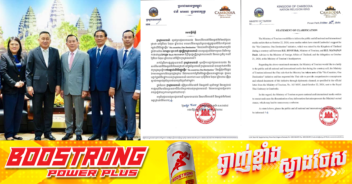 (ភ្នំពេញ)៖ ក្រសួងទេសចរណ៍បានចេញសេចក្ដីបំភ្លឺជូនថា នៅថ្ងៃទី២២ ខែតុលា ឆ្នាំ២០២៤ មានសារព័ត៌មានមួយចំនួនបានផ្សព្វផ្សាយអំពីជំហរគាំទ្ររបស់កម្ពុជាលើគំនិតផ្តួចផ្តើម Six countries, One Destination (ប្រទេស៦គោលដៅតែមួយ) ដែលបានលើកឡើងដោយភាគីថៃ ក្នុងឱកាសដែលលោក ហួត ហាក់ រដ្ឋមន្ត្រីក្រសួងទេសចរណ៍ បានទទួលជួបពិភាក្សាការងារជាមួយលោក តុសិត មនាព័ន្ធ (Dusit MANAPAN) ទីប្រឹក្សារដ្ឋមន្ត្រីក្រសួងការបរទេសថៃ និងគណៈប្រតិភូ កាលពីថ្ងៃទី២១ ខែតុលា ឆ្នាំ២០២៤ នៅទីស្តីការក្រសួងទេសចរណ៍។ ពាក់ព័ន្ធនឹងការផ្សព្វផ្សាយខាងលើ ក្រសួងទេសចរណ៍បានបញ្ជាក់ជូនសាធារណជន និងសារព័ត៌មានជាតិនិងអន្តរជាតិទាំងអស់ជ្រាបថា នៅក្នុងជំនួបខាងលើ ក្រសួងទេសចរណ៍បានបញ្ជាក់ទៅភាគីថៃថាក្រសួងសូមធ្វើការកត់សម្គាល់លើគំនិតផ្តួចផ្តើម Six countries, One