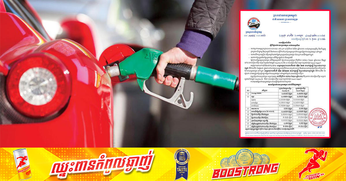 (ភ្នំពេញ)៖ ក្រសួងពាណិជ្ជកម្ម នៅថ្ងៃទី១១ ខែតុលា ឆ្នាំ២០២៤នេះ បានចេញសេចក្តីជូនដំណឹង ប្រកាសពីតម្លៃលក់រាយប្រេងឥន្ធនៈ នៅតាមស្ថានីយនានាដោយចាប់ពីថ្ងៃនេះ ដល់ថ្ងៃទី២០ ខែតុលា ឆ្នាំ២០២៤ ត្រូវលក់សាំងធម្មតាតម្លៃ ៣,៩៥០រៀល និងម៉ាស៊ូតត្រូវលក់ ៣,៨០០រៀល ក្នុង១លីត្រ៕ ផ្ដល់សិទ្ធិដោយ៖ Fresh News