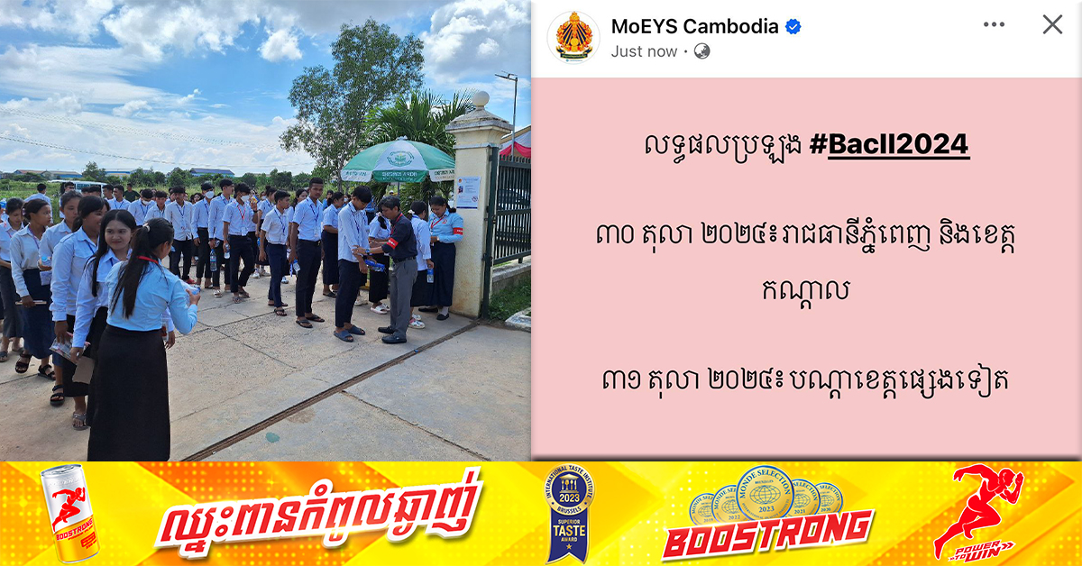 (ភ្នំពេញ)៖ ក្រសួងអប់រំ យុវជន និងកីឡា នាល្ងាចថ្ងៃទី០៩ ខែតុលា ឆ្នាំ២០២៤នេះ បានបញ្ជាក់ឱ្យដឹងថា លទ្ធផលប្រឡងសញ្ញាបត្រមធ្យមសិក្សាទុតិយភូមិ ឆ្នាំ២០២៤ នឹងចេញសម្រាប់រាជធានីភ្នំពេញ និងខេត្តកណ្តាល នៅថ្ងៃទី៣០ ខែតុលា និងបណ្តាខេត្តផ្សេងៗ ថ្ងៃទី៣១ ខែតុលា ឆ្នាំ២០២៤។ សូមបញ្ជាក់ថា ការប្រឡងសញ្ញាបត្រមធ្យមសិក្សាទុតិយភូមិ សម័យប្រឡង៖ ០៨ តុលា ២០២៤ មានបេក្ខជនចុះឈ្មោះប្រឡងសរុបចំនួន ១៣៧ ០៤០ នាក់ (ស្រី ៧៤ ៨៨២នាក់) ក្នុងនោះ៖ បេក្ខជនថ្នាក់វិទ្យាសាស្ត្រ មានចំនួន៣៩ ៣៥៨