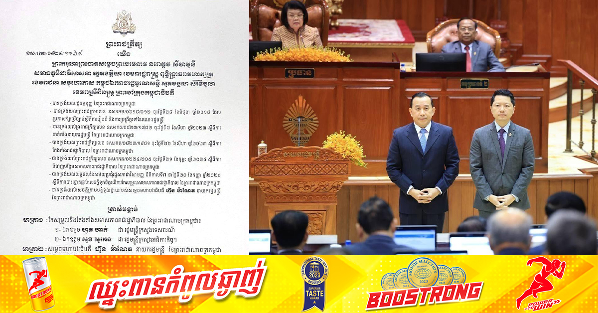 (ភ្នំពេញ)៖ សម្តេចតេជោ ហ៊ុន សែន ប្រមុខរដ្ឋស្តីទីនៃកម្ពុជា នៅថ្ងៃទី២០ ខែកញ្ញា ឆ្នាំ២០២៤នេះ បានចេញព្រះរាជក្រឹត្យ កែសម្រួល និងតែងតាំងលោក ហួត ហាក់ ជារដ្ឋមន្ត្រីក្រសួងទេសចរណ៍ និងលោក សុខ សូកេន ជារដ្ឋមន្ត្រីក្រសួងអធិការកិច្ច។ ផ្ដល់សិទ្ធិដោយ៖ Fresh News