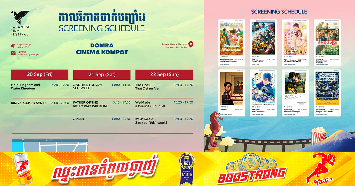 (កំពត)៖ ខ្សែភាពយន្តរបស់ជប៉ុនជាច្រើនរឿង នឹងចាក់បញ្ចាំងជូនសាធារណជនទស្សនាដោយឥតគិតថ្លៃចាប់ពីថ្ងៃទី២០ ដល់ថ្ងៃទី២២ ខែកញ្ញា ឆ្នាំ២០២៤។ ខ្សែភាពយន្តទាំងនេះ នឹងចាក់បញ្ចាំងនៅរោងភាពយន្ត Domra Cinema Kampot។ នេះគឺជាការរៀបចំចាក់បញ្ចាំងលើកដំបូងដោយមហោស្រពភាពយន្តជប៉ុន ក្នុងរយៈពេល១០ឆ្នាំ។ សម្រាប់ចំណងជើងរឿង និងកាលវិភាគនៃការចាក់បញ្ចាំងមានដូចខាងក្រោម៖ ផ្ដល់សិទ្ធិដោយ៖ Fresh News