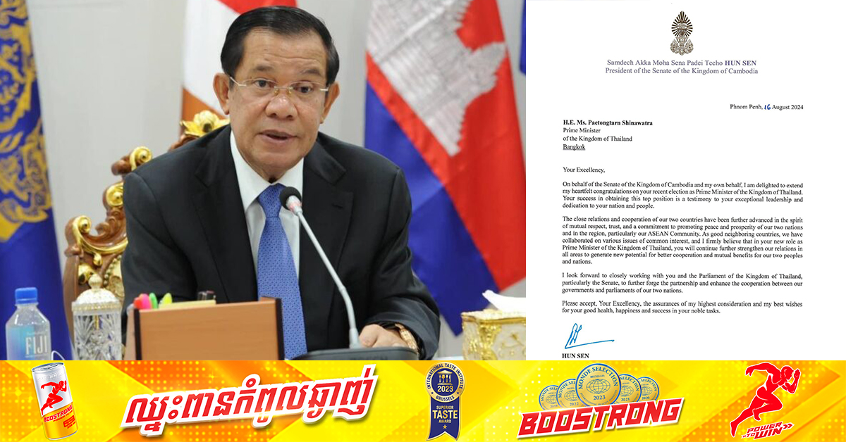 (ភ្នំពេញ)៖ សម្តេចតេជោ ហ៊ុន សែន ប្រធានព្រឹទ្ធសភាកម្ពុជា នៅថ្ងៃទី១៦ ខែសីហា ឆ្នាំ២០២៤នេះ បានផ្ញើសារអបអរសាទរជូន លោកស្រី Paetongtarn Shinawatra កូនស្រីពៅ លោក ថាក់ ស៊ីន ដែលត្រូវបានតែងតាំងជា នាយករដ្ឋមន្ត្រីថ្មីរបស់ថៃ។ តាមរយៈសារលិខិតដែលបណ្តាញព័ត៌មាន Fresh News ទទួលបាន សម្តេចតេជោ ហ៊ុន សែន បានលើកឡើងដូច្នេះថា៖ «លោកជំទាវ ជាទីគោរពរាប់អាន! ក្នុងនាមព្រឹទ្ធសភានៃព្រះរាជាណាចក្រកម្ពុជា និងក្នុងនាមខ្លួនខ្ញុំផ្ទាល់ ខ្ញុំសូមចូលរួមអបអរសាទរ ដោយក្តីសោមនស្សរីករាយ និងដោយស្មោះអស់ពីដួងចិត្តជូនចំពោះ លោកជំទាវ ដែលបានជាប់ឆ្នោតជា