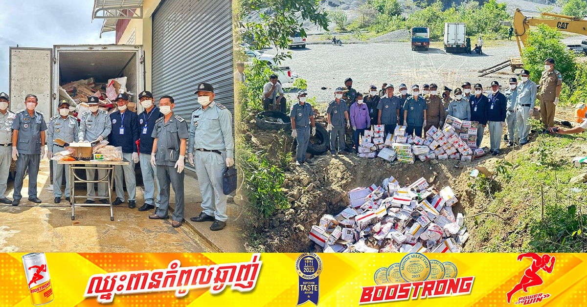 (កំពង់ស្ពឺ)៖ សាច់បង្កកប្រមាណជាង៦តោន ត្រូវបានកម្លាំងមន្ត្រីសាខាគយនិងរដ្ឋាករខេត្តកំពង់ស្ពឺដុតបំផ្លាញចោល នារសៀលថ្ងៃទី១២ ខែសីហា ឆ្នាំ២០២៤ ក្រោយស្ទាក់ចាប់បានកាលពីវេលាម៉ោង ៩យប់ ថ្ងៃទី១១ ខែសីហា ឆ្នាំ២០២៤ នៅចំណុចផ្លូវចុះផ្លូវល្បឿនលឿនខាងលិច ស្ថិតក្នុងឃុំមហាសាំង ស្រុកភ្នំស្រួច ខេត្តកំពង់ស្ពឺ។ លោក ឈួន ហៃ ប្រធានសាខាគយនិងរដ្ឋាករខេត្តកំពង់ស្ពឺ បានឱ្យដឹងថា ដោយទទួលបានព័ត៌មានថា មានរថយន្តដឹកទំនិញមួយគ្រឿង ពាក់ផ្លាកលេខ ភ្នំពេញ 2BS-3550 ដឹកសាច់បង្កកទិសដៅពីភ្នំពេញទៅខេត្តព្រះសីហនុ តាមផ្លូវល្បឿនលឿន លោកក៏បានបញ្ជាមន្ត្រីគយ និងរដ្ឋាករ សហការជាមួយកម្លាំងកងរាជអាវុធហត្ថខេត្តកំពង់ស្ពឺ ចុះទៅគោលដៅដែលចង្អុលបង្ហាញនោះ។ នៅវេលាម៉ោងជាង៩យប់ ថ្ងៃខែឆ្នាំដដែល មន្ត្រីគយ ក៏បានជួបរថយន្តខាងលើបែកកង់ នៅចំណុចគីឡូម៉ែត្រលេខ K31+800