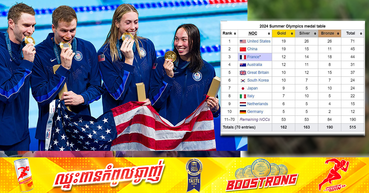 (បារីស)៖ គិតត្រឹមថ្ងៃទី០៥ ខែសីហានេះ ក្រុមអត្តពលិកអាមេរិក បានឡើងឈរកំពូលតារាងមេដាយនៃព្រឹត្តិការណ៍កីឡាអូឡាំពិក Paris Olympics Games 2024 ដោយមានមេដាយមាសស្មើគ្នាជាមួយក្រុមអត្តពលិកចិន ១៩គ្រឿង ខណៈម្ចាស់ផ្ទះបារាំង ឈរលេខ៣ មានមេដាយមាស ១២គ្រឿងសរុប ៤៤គ្រឿងជាបណ្តោះអាសន្ន ។ ក្រុមអត្តពលិកអាមេរិន បានឡើងឈរនាំមុខកំពូលតារាងមេដាយក្រោយរកបានមេដាយមាស ១៩គ្រឿង ប្រាក់ និងសំរឹទ្ធ ២៦គ្រឿងស្មើគ្នា ដោយសរុប ៧១គ្រឿង ដ្បិតក្រុមចិន មានមេដាយមាស ១៩គ្រឿង តែមានមេដាយប្រាក់តែ ១៥គ្រឿង ជាមួយមេដាយសំរឹទ្ធ ១១គ្រឿងសរុប ៤៥គ្រឿង ។ ក្នុងនោះក្រុមអូស្រ្តាលី