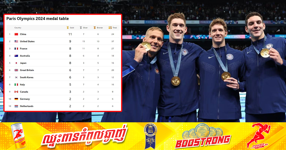 (ប៉ារីស)៖ ក្រុមអត្តពលិកសហរដ្ឋអាមេរិក បានហក់ពីចំណាត់ថ្នាក់លេខ៧ មកឈរលេខ២ វិញតាមពីក្រោយចិន ក្នុងតំណែងតារាងមេដាយអូឡាំពិក រដូវក្តៅនៅប្រទេសបារាំង គិតត្រឹមថ្ងៃសុក្រ ទី០២ ខែសីហា ឈ្នាំ២០២៤ នេះ។ យោងតាមការចេញផ្យាយដោយគេហទំព័រកីឡា BBC នៅថ្ងៃនេះបានឱ្យដឹងថា អាមេរិកបានកើនមេដាយមាសដល់ ៩គ្រឿង ក្នុងចំណោមេដាយសរុប ៣៧គ្រឿងជាបណ្តោះអាសន្ននៅអូឡាំពិក លើកទី៣៣ នាទីក្រុងប៉ារីស ស្របពេលចិន ដែលឈ្នះមេដាយសរុប ២៤គ្រឿងឈរទីកំពូលតារាង ដោយសារមានមេដាយមាសលើសអាមេរិក ២គ្រឿង។ យ៉ាងណាក៏ដោយ ការប្រកួតប្រជែងមេដាយនៅអូឡាំពិក រដូវក្តៅ ឆ្នាំ២០២៤ នឹងបន្តរហូតដល់ថ្ងៃទី១១ ខែសីហា ទើបបញ្ចប់ គ្រាដែលម្ចាស់ផ្ទះបារាំងធ្លាក់ពីលេខ២ មកលេខ៣