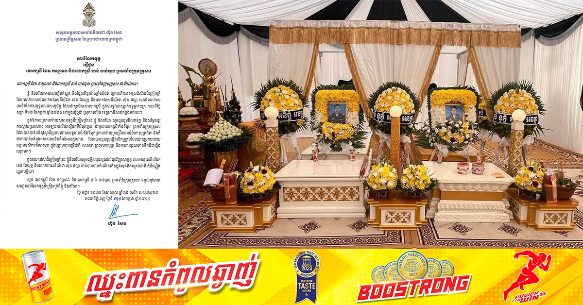 (ភ្នំពេញ)៖ សម្តេចតេជោ ហ៊ុន សែន ប្រធានព្រឹទ្ធសភាកម្ពុជា នៅល្ងាចថ្ងៃទី៣០ ខែកក្កដា ឆ្នាំ២០២៤នេះ បានផ្ញើសារជូនក្រុមគ្រួសារសព ដោយចូលរួមរំលែកទុក្ខយ៉ាងក្រៀមក្រំបំផុតចំពោះ មរណភាពរបស់ អាកាសយានិក២រូប គឺលោក ស៊ុន ផល្លា និងលោក ខេង ឆៃយុទ្ធ ដែលបានស្លាប់ក្នុងឧបទ្ទវហេតុធ្លាក់ឧទ្ធម្ភាគចក្រ នៅលើភ្នំយ៉ាវយ៉ៃ ស្ថិតនៅខេត្តពោធិ៍សាត់។ តាមរយៈសារលិខិតផ្ញើទៅកាន់ លោកស្រី ឆែម កល្យាណ និងលោកស្រី ខាន់ ចាន់ធុល ព្រមទាំងក្រុមគ្រួសារ សម្តេចបានលើកឡើងថា «ខ្ញុំ និងភរិយាមានសេចក្តីតក់ស្លុត និងរំជួលចិត្តយ៉ាងខ្លាំងបំផុត ក្រោយពីបានទទួលដំណឹងដ៏ក្រៀមក្រំ នៃមរណភាពរបស់