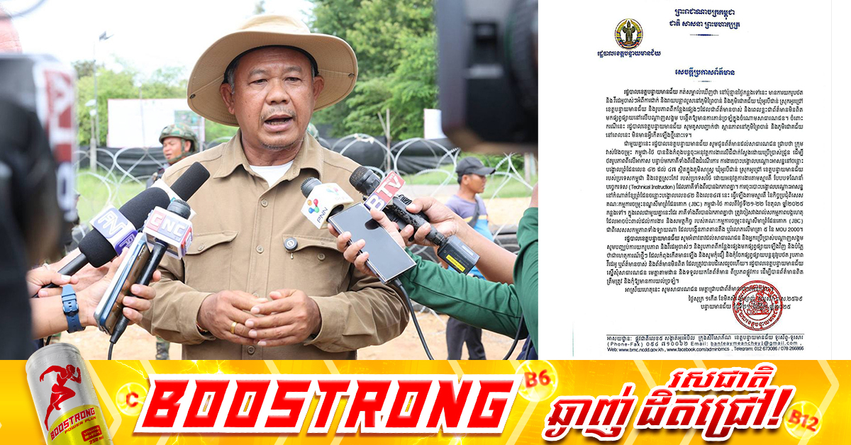 (បន្ទាយមានជ័យ)៖ រដ្ឋបាលខេត្តបន្ទាយមានជ័យ កត់សម្គាល់ឃើញថា នៅប៉ុន្មានថ្ងៃកន្លងទៅនេះ មានការយករូបថត និងវីដេអូចាស់ៗអំពីការដាក់ និងរាយបន្លាលួសនៅភូមិព្រៃចាន់ និងភូមិជោគជ័យ ឃុំអូរបីជាន់ ស្រុកអូរជ្រៅ ខេត្តបន្ទាយមានជ័យ និងរូបភាពពីកន្លែងផ្សេងៗដែលជាព័ត៌មានចាស់ និងពេលខ្លះជាព័ត៌មានមិនពិត មកផ្សព្វផ្សាយនៅលើបណ្តាញសង្គម បង្កើតឱ្យមានការភាន់ច្រឡំក្នុងចំណោមសាធារណជន។ ចំពោះករណីនេះ រដ្ឋបាលខេត្តបន្ទាយមានជ័យ សូមគូសបញ្ជាក់ថា ស្ថានភាពនៅភូមិព្រៃចាន់ និងភូមិជោគជ័យ នៅពេលនេះ មិនមានអ្វីកើតឡើងថ្មីនោះទេ។ ជាមួយគ្នានេះ រដ្ឋបាលខេត្តបន្ទាយមានជ័យ សូមជូនព័ត៌មានដល់សាធារណជន ជ្រាបថា ក្រុមវាស់វែងចម្រុះ កម្ពុជា-ថៃ បាននិងកំពុងបន្តចុះអនុវត្តការងារលើដីជាក់ស្តែងដោយប្រើប្រាស់ដ្រូន ដើម្បីថតរូបភាពពីលើអាកាស បន្ទាប់មកភាគីទាំងពីរនឹងដំណើរការ ការងារបោះបង្គោលបណ្តោះអាសន្ននៅចន្លោះ បង្គោលព្រំដែនលេខ ៤២ ដល់