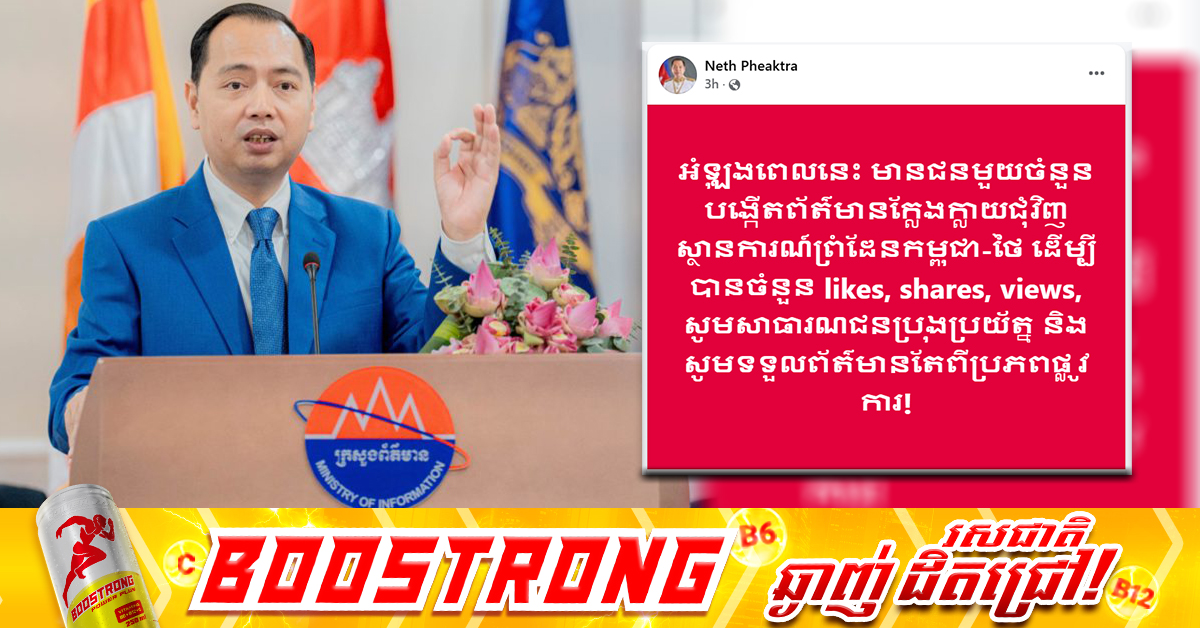 (ភ្នំពេញ)៖ លោក នេត្រ ភក្ត្រា រដ្ឋមន្ត្រីក្រសួងព័ត៌មាន បានរម្លឹកថា អំឡុងពេលនេះ មានជនមួយចំនួនបង្កើតព័ត៌មានក្លែងក្លាយជុំវិញស្ថានការណ៍ព្រំដែនកម្ពុជា-ថៃ ដើម្បីបានចំនួន likes, shares, views ដូច្នេះសូមសាធារណជនប្រុងប្រយ័ត្ន និងសូមទទួលព័ត៌មានតែពីប្រភពផ្លូវការ។ នៅក្នុងរយៈពេល ៩ខែ ឆ្នាំ២០២៥ គណៈកម្មការប្រឆាំងព័ត៌មានក្លែងក្លាយ រួមមានដំណឹងក្លែងក្លាយ ព័ត៌មានមិនពិត ការញុះញង់បំពុលសង្គម ការប្រមាថ និងព័ត៌មានមិនពិតទាក់ទងនឹងជម្លោះព្រំដែនចំនួន ២,៨១០ករណី ក្នុងនោះការបំភ្លៃខុសពីការពិត ការប្រឌិតព័ត៌មានទាក់ទងនឹងរាជរដ្ឋាភិបាល និងបញ្ហាព្រំដែនចំនួន ២,១២២ករណី។ ក្នុងកិច្ចខិតខំប្រឹងប្រែងលុបបំបាត់ និងប្រឆាំងនឹងព័ត៌មានក្លែងក្លាយនេះ, គណៈកម្មការប្រឆាំងនឹងព័ត៌មានក្លែងក្លាយដឹកនាំដោយក្រសួងព័ត៌មានបានដាក់ចុះនូវវិធានការជាច្រើនដោយអនុវត្តអភិក្រម «ពន្លត់ភ្លើង មិនអង្គុយបកផ្សែង» ដោយ៖ ទី១៖