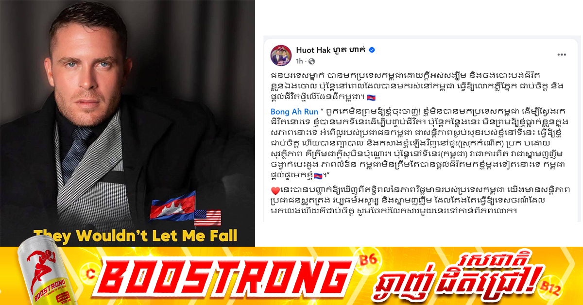 (ភ្នំពេញ)៖ លោក ហួត ហាក់ រដ្ឋមន្ត្រីក្រសួងទេសចរណ៍កម្ពុជា តាមរយៈបណ្តាញទំនាក់ទំនងសង្គមផ្លូវការរបស់ខ្លួន នៅព្រឹកថ្ងៃទី១១ ខែវិច្ឆិកា ឆ្នាំ២០២៥នេះ បានចែករំលែករឿងរ៉ាវជីវិតរបស់ជនបរទេសម្នាក់ ឈ្មោះ Bong Ah Run ដែលបានមករស់នៅកម្ពុជា។ បើតាមលោករដ្ឋមន្ត្រី, ជនបរទេសម្នាក់នេះ បានមកប្រទេសកម្ពុជាដោយក្ដីអស់សង្ឃឹម និងចង់បោះបង់ជីវិតខ្លួនឯងចោល ប៉ុន្ដែនៅពេលដែលបានមករស់នៅកម្ពុជា ធ្វើឱ្យលោកភ្លឺភ្នែក ជាប់ចិត្ត និងផ្ដល់ជីវិតថ្មីលើដែនដីកម្ពុជា។ លោករដ្ឋមន្ត្រីទេសចរណ៍ បានដកស្រង់សំដីផ្ទាល់របស់ Bong Ah Run ដែលនិយាយថា «ពួកគេមិនព្រមឱ្យខ្ញុំចុះចាញ់! ខ្ញុំមិនបានមកប្រទេសកម្ពុជា ដើម្បីស្វែងរកជីវិតនោះទេ ខ្ញុំបានមកទីនេះដើម្បីបញ្ចប់ជីវិត។ ប៉ុន្ដែកន្លែងនេះ មិនព្រមឱ្យខ្ញុំធ្លាក់ខ្លួនក្នុងសភាពនោះទេ អំពើល្អរបស់ប្រជាជនកម្ពុជា