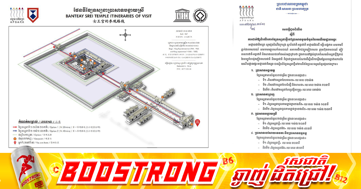 (សៀមរាប)៖ អាជ្ញាធរជាតិអប្សរា បានចេញសេចក្តីជូនដំណឹង ស្តីពីការដាក់ឱ្យដំណើរការ ខ្សែទស្សនាថ្មីនៅប្រាសាទមួយចំនួន នៃរមណីយដ្ឋានអង្គរ។ នេះបើតាមសេចក្ដីជូនដំណឹង ដែលបណ្ដាញព័ត៌មាន Fresh News ទទួលបាននៅថ្ងៃទី២៧ ខែតុលា ឆ្នាំ២០២៥។ សេចក្ដីជូនដំណឹង បានឲ្យដឹងថា ក្នុងគោលដៅផ្តល់នូវបទពិសោធន៍ទស្សនាថ្មី ឱ្យកាន់តែសម្បូរបែបជូនភ្ញៀវទេសចរជាតិ និងអន្តរជាតិ ក៏ដូចជាក្នុងគោលបំណង ដើម្បីលើកតម្កើងតម្លៃលេចធ្លោជាសកល នៃរមណីយដ្ឋានអង្គរ អាជ្ញាធរជាតិអប្សរា បានរៀបចំខ្សែទស្សនាថ្មី នៅតាមទីតាំងប្រាសាទមួយចំនួន ដូចខាងក្រោម៖ * ១៖ ប្រាសាទអង្គរវត្តខ្សែទស្សនាមានចំនួន០៣ជម្រើស ក្នុងនោះមានដូចជា៖ទី១ «ទិសដៅទស្សនាបែបទេសចរ» រយៈពេល ០២ម៉ោងទី២ «ទិសដៅទស្សនាបែបជំនឿ និងសាសនា» រយៈពេល