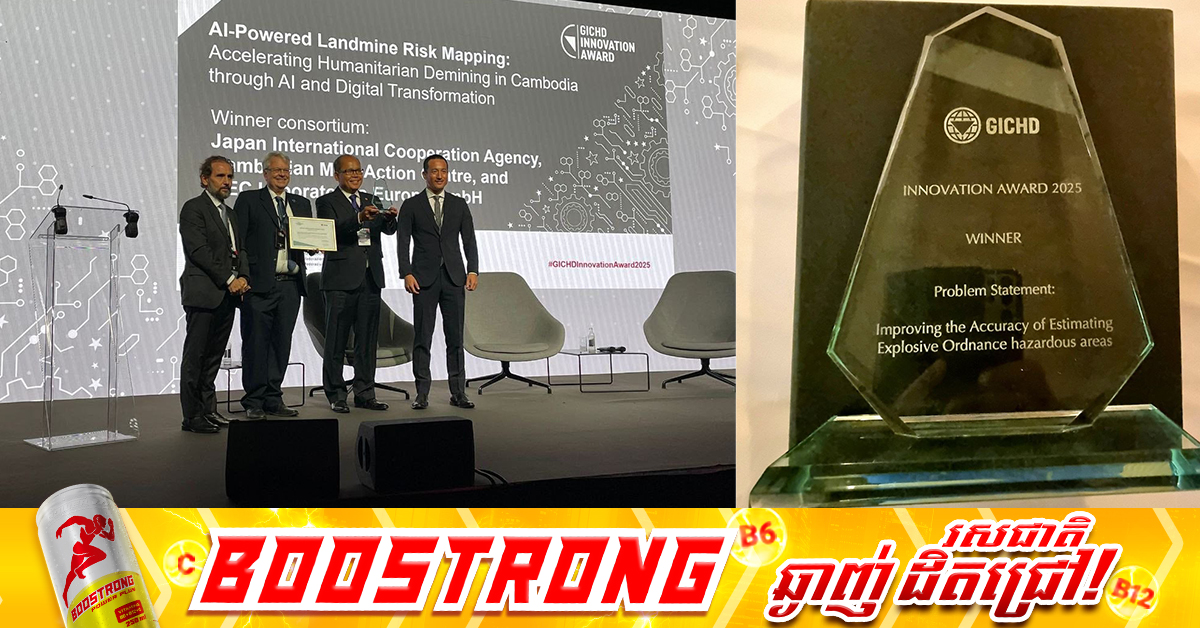 (លុចសំបួ)៖ លោក ហេង រតនា ប្រតិភូរាជរដ្ឋាភិបាលទទួលបន្ទុកជាអគ្គនាយក CMAC បានឱ្យដឹងថា នៅថ្ងៃទី២៨ ខែតុលា ឆ្នាំ២០២៥ ប្រទេសលុចសំបួ (Luxembourg) ខណៈនៅកម្ពុជា ត្រូវនឹងថ្ងៃទី២៩ ខែតុលា ឆ្នាំ២០២៥ អង្គភាពស៊ីម៉ាក់កម្ពុជា (CMAC) និងទីភ្នាក់ងារ សហប្រតិបត្តិការអន្តរជាតិ (JICA) ព្រមទាំងក្រុមហ៊ុន NEC ជប៉ុន បានទទួលជ័យលាភី ឈ្នះការប្រកួតប្រជែងខាងនវានុវត្តន៍ ឆ្នាំ២០២៥ ពីមជ្ឈមណ្ឌលអន្តរជាតិ ក្រុងស្សឺណែវ សម្រាប់ការបោសសម្អាតមីនមនុស្សធម៌ (Geneva International Centre for Humanitarian