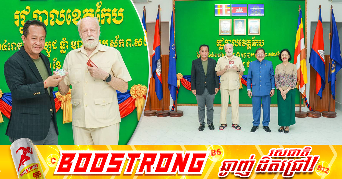 (កែប)៖ លោក ខៀវ កាញារីទ្ធ ឧត្ដមប្រឹក្សាផ្ទាល់ព្រះមហាក្សត្រ និងលោកបណ្ឌិត សោម ពិសិដ្ឋ អភិបាលខេត្តកែប បានប្រគល់ព្រះរាជក្រឹត្យផ្ដល់សញ្ជាតិខ្មែរដល់លោក ក្លែន ន័បឺត ហាន់ (KLEIN NORBERT HAN) ជនជាតិអអាល្លឺម៉ង់ កើតនៅថ្ងៃទី៣ ខែមេសា ឆ្នាំ១៩៣៤ ទីក្រុង NOVIVRBAS សាធារណរដ្ឋស៊ែបី។ ពិធីប្រគល់ព្រះរាជក្រឹត្យផ្ដល់សញ្ជាតិខ្មែរខាងលើ បានធ្វើឡើងនាថ្ងៃទី២១ ខែតុលា ឆ្នាំ២០២៥ នៅសាលាខេត្តកែប ដោយចូលរួមពីសំណាក់ប្រតិភូអមដំណើរ និងថ្នាក់ដឹកនាំខេត្តជាច្រើនរូប។ លោក KLEIN NORBERT HAN ត្រូវបានព្រះករុណា