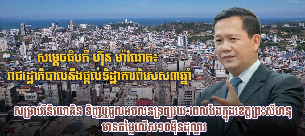 សម្តេចធិបតី ហ៊ុន ម៉ាណែត៖ រាជរដ្ឋាភិបាលនឹងផ្តល់ទិដ្ឋាការពិសេស៣ឆ្នាំ សម្រាប់វិនិយោគិន ទិញឬជួលអចលនទ្រព្យរយៈពេលវែងក្នុងខេត្តព្រះសីហនុ មានតម្លៃលើស១០ម៉ឺនដុល្លារ