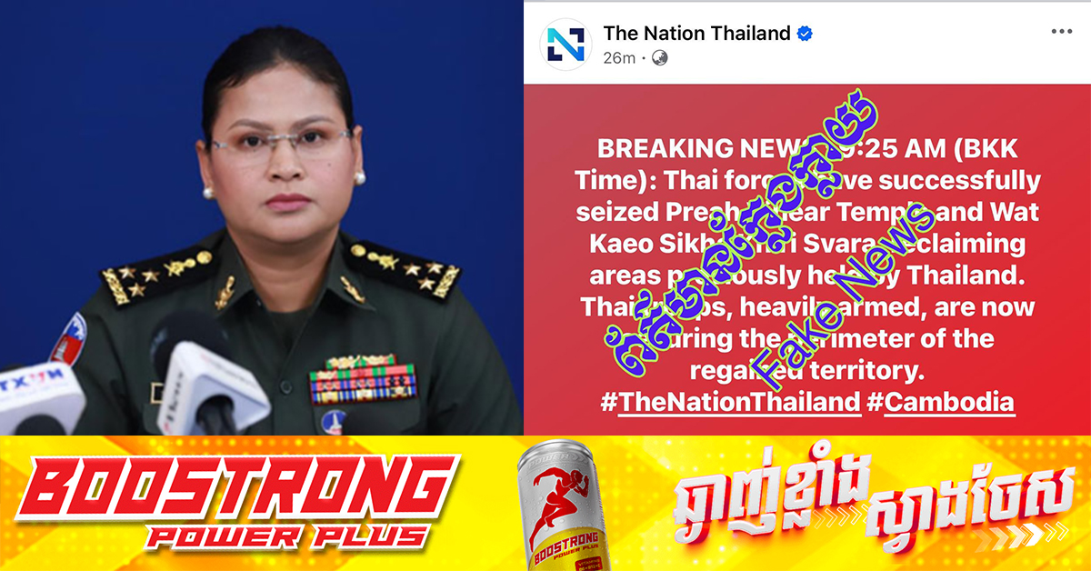 (ភ្នំពេញ)៖ លោកស្រី ម៉ាលី សុជាតា អ្នកនាំពាក្យក្រសួងការពារជាតិកម្ពុជា នៅព្រឹកថ្ងៃទី២៥ ខែកក្កដា ឆ្នាំ២០២៥នេះ បានចេញមកច្រានចោលទាំងស្រុង នូវការផ្សាយព័ត៌មានមិនពិត គ្មានវិជ្ជាជីវៈរបស់សារព័ត៌មាន The Nation Thailand ដែលថាយោធាថៃចូលកាន់កាប់ប្រាសាទព្រះវិហារ និងវត្តកែវសិក្ខាគិរីស្វារៈ។ អ្នកនាំពាក្យក្រសួងការពារជាតិកម្ពុជា បញ្ជាក់ថា ការផ្សាយរបស់សារព័ត៌មានថៃ ដែលថា កងទ័ពខ្លួន បានកាន់កាប់ប្រាសាទព្រះវិហារ និងវត្តកែវសិក្ខាគិរីស្វារៈ គឺជាព័ត៌មានក្លែងក្លាយព្រោះរហូតដល់ពេលនេះ គឺគ្រប់គ្រងដោយកងទ័ពកម្ពុជានៅឡើយទេ។ បន្ថែមលើសពីនេះ ជាការកត់សម្គាល់សារព័ត៌មាន The Nation Thailand តែងតែផ្សព្វផ្សាយខុសពីការពិត គ្មានវិជ្ជាជីវៈជាសារព័ត៌មាននោះទេ។ ជាក់ស្តែងនាថ្ងៃទី២៤ ខែកក្កដាម្សិលមិញ ព័ត៌មានផ្សាយបែបបំពុលថា