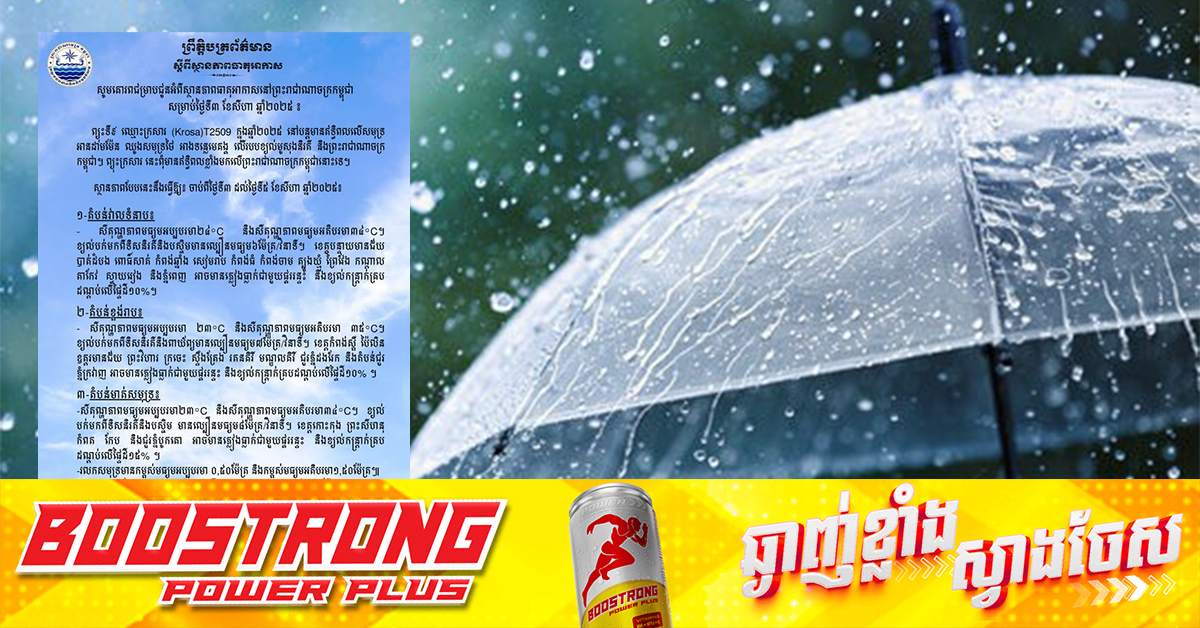 ក្រសួងធនធានទឹក និងឧតុនិយម បានចេញសេចក្តីជូនដំណឹង អំពីស្ថានភាពធាតុអាកាសនៅកម្ពុជា សម្រាប់ថ្ងៃទី៣ ខែកក្កដា ឆ្នាំ២០២៥។ ក្នុងនោះ ក្រសួងធនធានទឹក និងឧតុនិយម បានប្រកាសថា ព្យុះទី៩ ឈ្មោះក្រសារ (Krosa)T2509 ក្នុងឆ្នាំ២០២៥ នៅបន្តមានឥទ្ធិពលលើសមុទ្រ អានដាមម៉ែន ឈូងសមុទ្រថៃ អាងទន្លេមេគង្គ លើរបបខ្យល់មូសុងនិរតី និងព្រះរាជាណាចក្រកម្ពុជា។ ព្យុះក្រសារ នេះពុំមានឥទ្ធិពលខ្លាំងមកលើព្រះរាជាណាចក្រកម្ពុជានោះទេ។ ស្ថានភាពបែបនេះនឹងធ្វើឱ្យចាប់ពីថ្ងៃទី៣ ដល់ថ្ងៃទី៥ សីហាឆ្នាំ២០២៥៕