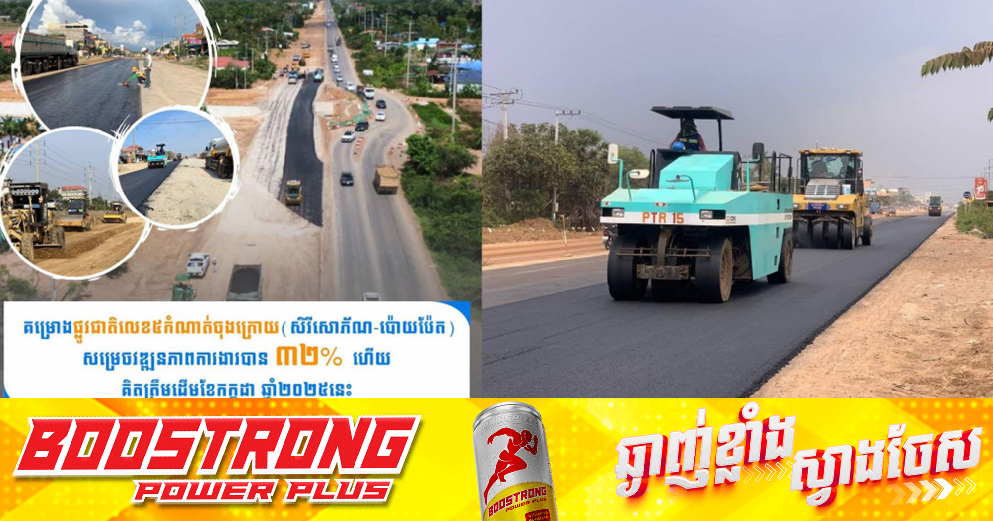 (បន្ទាយមានជ័យ)៖ កំណាត់ចុងក្រោយ នៃគម្រោងសាងសង់ផ្លូវជាតិលេខ៥ ពី សិរីសោភ័ណ-ប៉ោយប៉ែត ខេត្តបន្ទាយមានជ័យ មានប្រវែង ៣៥,១៤ គីឡូម៉ែត្រ សម្រចបានលទ្ធផលជារួម ៣២% ហើយ គិតត្រឹមដើមខែកក្កដា ឆ្នាំ២០២៥នេះ។ បើគ្មានការប្រែប្រួលទេ កំណាត់ផ្លូវជាតិលេខ៥ នៃគម្រោងស្តារ និងលើកកម្រិតគុណភាពផ្លូវជាតិលេខ៥ កំណាត់ចុងក្រោយនេះ គ្រោងនឹងបញ្ចប់ក្នុងអំឡុងឆ្នាំ២០២៦ ខាងមុខ។ ក្រសួងសាធារណការ និងដឹកជញ្ជូន សូមអំពាវនាវដល់អ្នកប្រើប្រាស់កំណាត់ផ្លូវជាតិលេខ៥ (សិរីសោភ័ណ-ប៉ោយប៉ែត) បើកបរដោយប្រុងប្រយ័ត្នខ្ពស់ ពោលគឺត្រូវបើកបរក្នុងល្បឿនមួយអាចគ្រប់គ្រងបាន ដើម្បីធានាសុវត្ថិភាពខ្លួនឯង និងអ្នកដទៃ និងបើកបរក្នុងល្បឿនសមល្មមកាត់បន្ថយការហុយធូលីភក់លើបងប្អូនប្រជាពលរដ្ឋនៅតាមដងផ្លូវ។ ទន្ទឹមនឹងនោះ ក្រសួងក៏សូមអំពាវនាវដល់ប្រជាពលរដ្ឋរស់នៅតាមសងខាងផ្លូវ និងប្រជាពលរដ្ឋធ្វើដំណើរ មានការយោគយល់ អធ្យាស្រ័យខ្ពស់