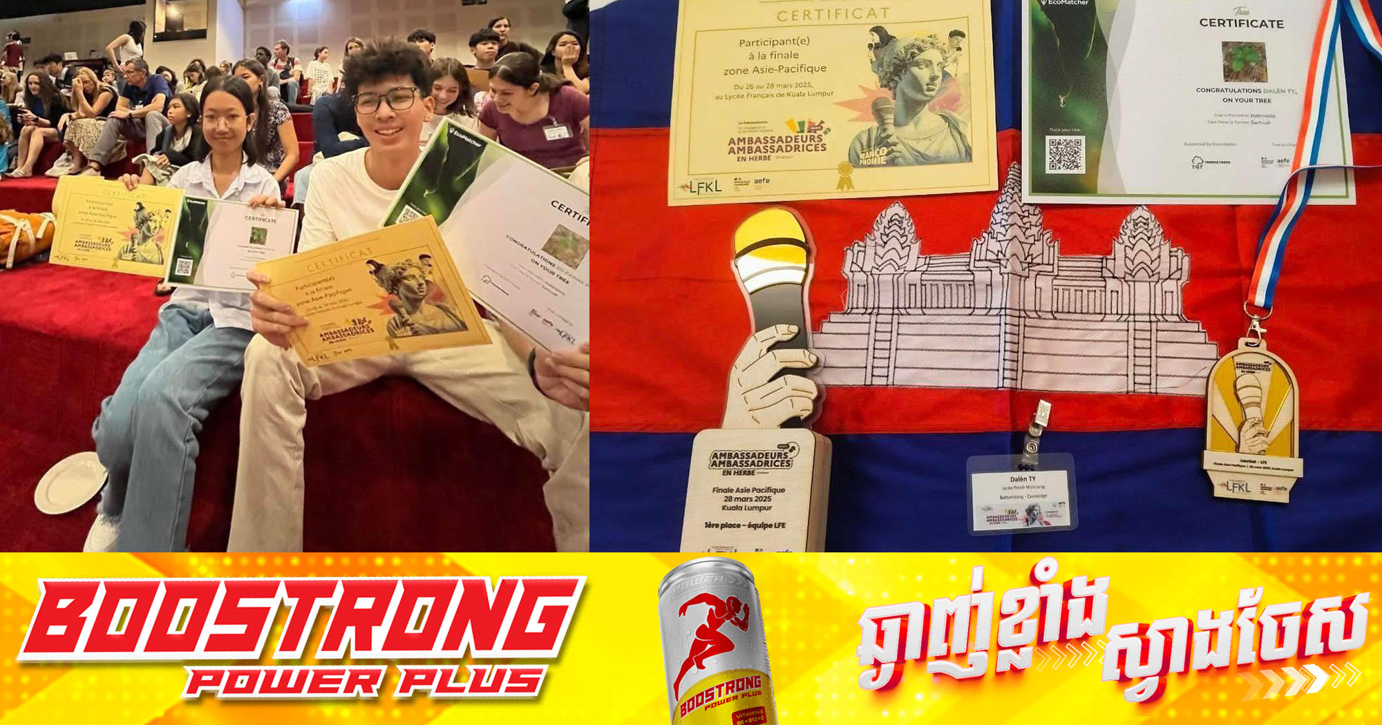 (ភ្នំពេញ)៖ ឧបនាយករដ្ឋមន្ត្រី ហង់ជួន ណារ៉ុន រដ្ឋមន្ត្រីក្រសួងអប់រំ យុវជន និងកីឡា បានបង្ហោះលើបណ្តាញសង្គមបង្ហាញយុវសិស្សពីររូប អមដោយពាន មេដាយ និងលិខិតបញ្ជាក់ពីការចូលរួមប្រកួតរបស់ពួកគេផងដែរ។ លោករដ្ឋមន្ត្រី បានបញ្ជាក់ថា យុវសិស្សពីរនាក់នេះ ជាបេក្ខជននិងបេក្ខនារីឆ្នើមមកពីថ្នាក់ពីរភាសាបារាំង-ខ្មែរនៃវិទ្យាល័យព្រះមុនីវង្ស ខេត្តបាត់ដំបង និងតំណាងឱ្យប្រទេសកម្ពុជា ទទួលបានចំណាត់លេខ១ ក្នុងការប្រកួតបញ្ចេញមតិជាសាធារណៈ (Concours d’éloquence) លក្ខណៈអន្តរជាតិក្នុងក្របខ័ណ្ឌគ្រឹះស្ថានសិក្សា ធ្វើឡើងនៅទីក្រុកូឡាឡាំពួ ប្រទេសម៉ាឡេស៊ី។ បើតាមលោករដ្ឋមន្ត្រី បានឱ្យដឹងថា នៅវគ្គផ្ដាច់ព្រ័ត្រ យុវសិស្សឆ្នើមទាំងពីររូបប្រកួតទល់នឹងក្រុមបេក្ខជនមកពីប្រទេសវៀតណាម។ ជ័យជម្នះយុវជនឆ្នើមទាំងពីររូប ទទួលបានស្លាកសញ្ញាឡាប៊ែលហ្រ្វង់(LabelFrancÉducation)៕ ផ្តល់សិទ្ធិដោយ៖ Fresh News