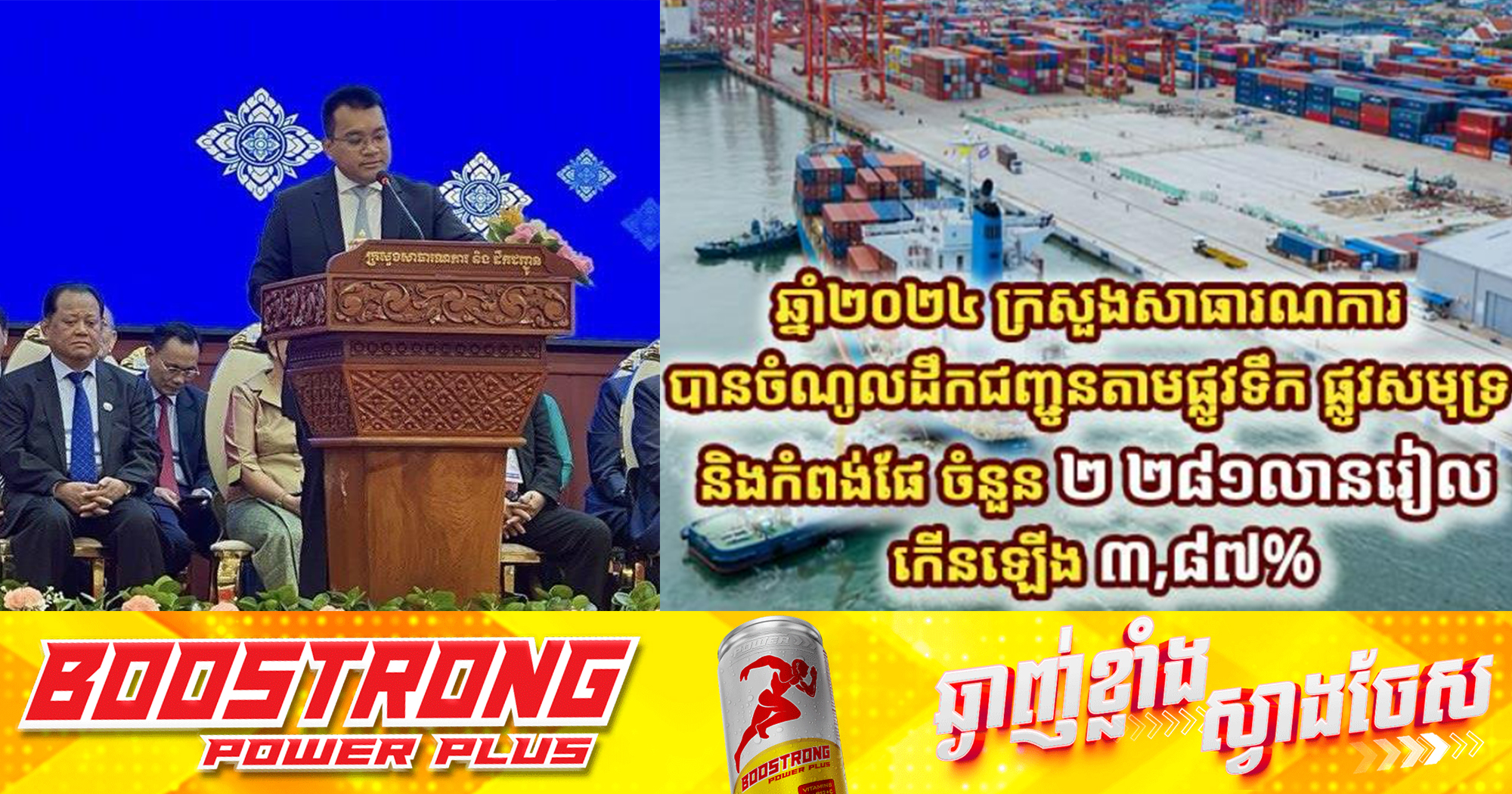 (ភ្នំពេញ)៖ នៅឆ្នាំ២០២៤ ក្រសួងសាធារណការនិងដឹកជញ្ជូន ទទួលបានចំណូល ពីសេវាដឹកជញ្ជូនតាមផ្លូវទឹក ផ្លូវសមុទ្រ និងកំពង់ផែ ចំនួន ២ ២៨១លានរៀល កើនឡើង ៣,៨៧% ធៀបនឹងឆ្នាំ២០២៣។ នេះបើតាមរបាយការណ៍ដែលបង្ហាញក្នុងសន្និបាតបូកសរុបការងារឆ្នាំ២០២៤ និងលើកទិសដៅការងារ ឆ្នាំ២០២៥ របស់ក្រសួងសាធារណការ និងដឹកជញ្ជូន នៅថ្ងៃទី២២ ខែមករា ឆ្នាំ២០២៥ ក្រោមអធិបតីភាព លោក ប៉េង ពោធិ៍នា រដ្ឋមន្ត្រីក្រសួងសាធារណការ និងដឹកជញ្ជូន នៅទីស្តីការក្រសួង។ របាយការណ៍ បានឲ្យដឹងថា ក្នុងឆ្នាំ២០២៤ ក្រសួងបានផ្តល់សេវាចុះបញ្ជី៖ ១) នាវាផ្លូវទឹកចំនួន ២៦គ្រឿង
