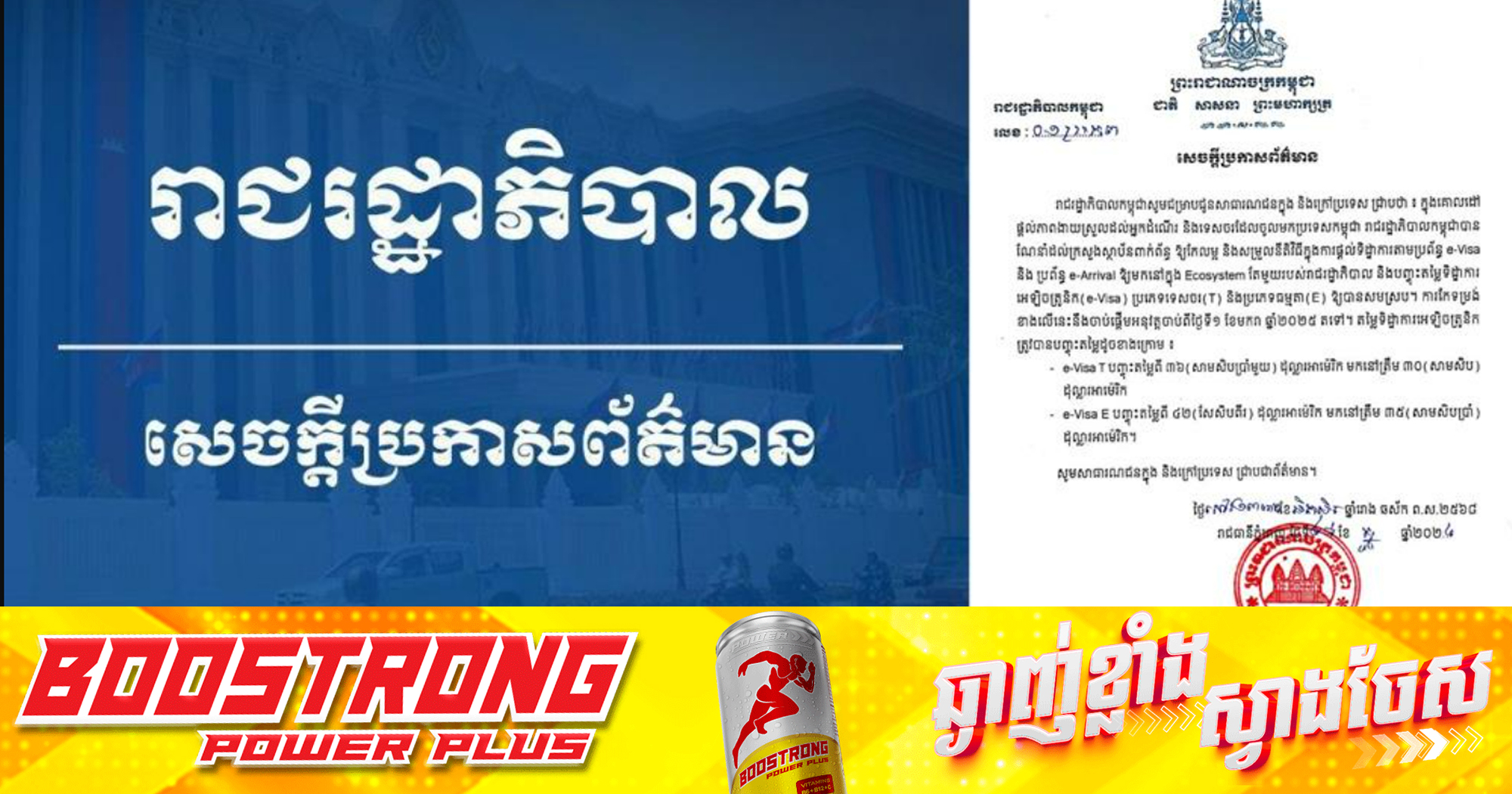 (ភ្នំពេញ)៖ រាជរដ្ឋាភិបាលកម្ពុជា ណែនាំដល់ក្រសួងស្ថាប័នពាក់ព័ន្ធឲ្យកែលម្អ និងសម្រួលនីតិវិធីក្នុងការផ្តល់ទិដ្ឋាការតាមប្រព័ន្ធ e-Visa និង ប្រព័ន្ធ e-Arrival ឲ្យមកនៅក្នុង Ecosystem តែមួយរបស់រាជរដ្ឋាភិបាល និងបញ្ចុះតម្លៃទិដ្ឋាការ អេឡិចត្រូនិក(e-Visa) ប្រភេទទេសចរ(T) និងប្រភេទធម្មតា(E) ឲ្យបានសមស្រប ដែលនឹងចាប់ផ្តើមអនុវត្តចាប់ពីថ្ងៃទី១ ខែមករា ឆ្នាំ២០២៥តទៅ។ ក្នុងសេចក្ដីប្រកាសព័ត៌មាន នៅថ្ងៃទី២៨ ខែធ្នូ ឆ្នាំ២០២៤នេះ បានបញ្ជាក់ថា តម្លៃទិដ្ឋាការអេឡិចត្រូនិក ត្រូវបានបញ្ចុះតម្លៃដូចខាងក្រោម៖ *ទី១៖ e-Visa T បញ្ចុះតម្លៃពី ៣៦ (សាមសិបប្រាំមួយ) ដុល្លារ មកនៅត្រឹម៣០(សាមសិប) ដុល្លារ។ *ទី២៖ e-Visa