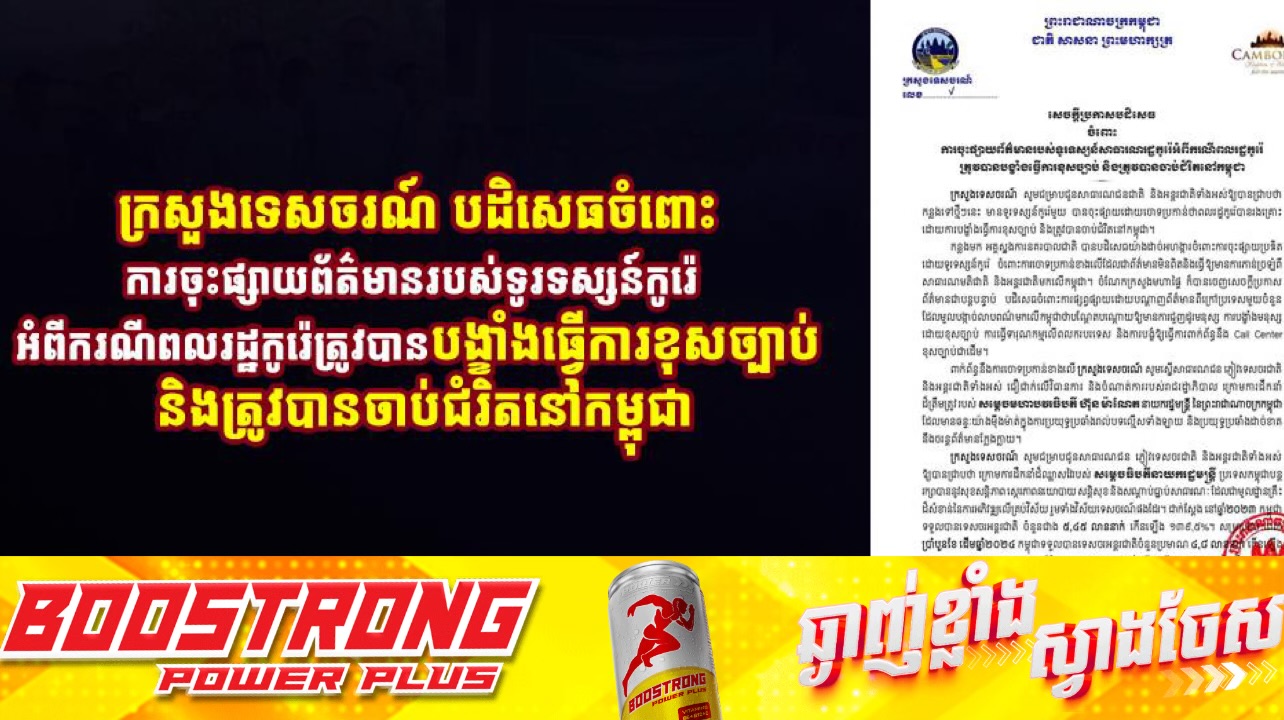 (ភ្នំពេញ)៖ ក្រសួងទេសចរណ៍ បានចេញសេចក្តីប្រកាសបដិសេធចំពោះការចុះផ្សាយព័ត៌មានរបស់ទូរទស្សន៍សាធារណរដ្ឋកូរ៉េ អំពីករណីពលរដ្ឋកូរ៉េត្រូវបានបង្ខាំងធ្វើការខុសច្បាប់ និងត្រូវបានចាប់ជំរិតនៅកម្ពុជា។ ផ្តល់សិទ្ធិដោយ៖ Fresh News