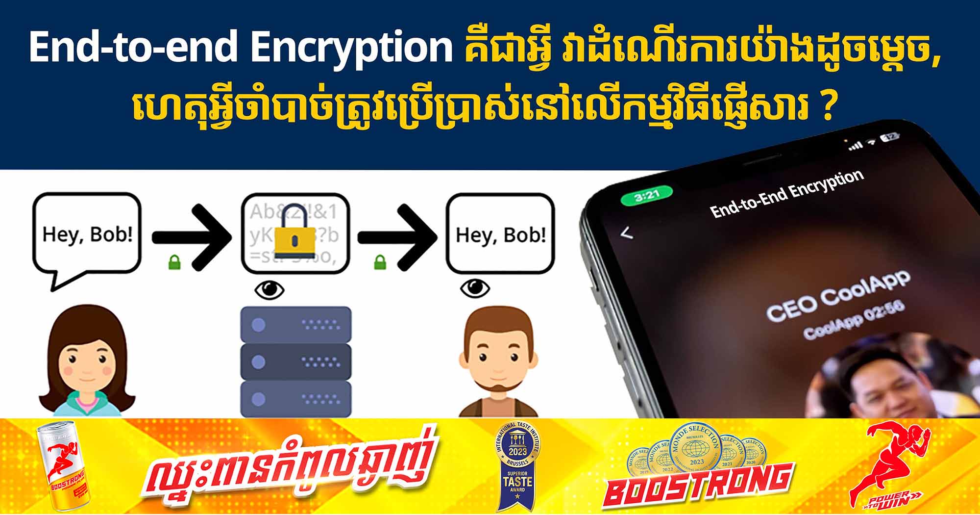 (បរទេស)៖ បន្ទាប់ពីមានការលើកឡើង និងការបង្ហាញពីក្ដីព្រួយបារម្ភជាខ្លាំងទៅលើការឃ្លាំមើលទាក់ទាក់នឹងឯកជនភាព (មើលសារ ឬរូបភាព) របស់អ្នកប្រើប្រាស់។ ក្រុមអ្នកអភិវឌ្ឍន៍កម្មវិធីផ្ញើសារលើពិភពលោក បាននាំគ្នាបញ្ចូលនូវបច្ចេកវិទ្យាមួយដែលមានឈ្មោះថា End-to-end encryption ឬ E2EE។ តើ End-to-end encryption ឬ E2EE គឺជាអ្វី ហើយវាដំណើរការយ៉ាងដូចម្ដេច? E2EE គឺជាវិធីសាស្រ្តមួយដែលត្រូវបានគេប្រើដើម្បីរក្សាសុវត្ថិភាពការហៅទូរស័ព្ទ ឬសាររបស់អ្នកប្រើប្រាស់នៅលើកម្មវិធី Chat ណាមួយ ដោយមិនអនុញ្ញាតឱ្យភាគីទី៣ អាចលួចស្ដាប់ការសន្ទនា ឬអានសារបានឡើយ ក្នុងនោះសូម្បីតែអ្នកផលិតកម្មវិធីនោះដោយផ្ទាល់ក៏មិនអាចចូលទៅស្ដាប់ និងអានសារបានផងដែរ។ និយាយជារួម នៅពេលដែលលោកអ្នកផ្ញើសារទៅឱ្យនរណាម្នាក់ នោះ E2EE វានឹងធ្វើការបំប្លែងសារនោះចេញជាកូដសម្ងាត់ ដែលមិនអាចមាននរណាស្ដាប់