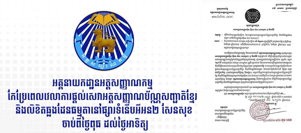 (ភ្នំពេញ)៖ អគ្គនាយកដា្ឋនអត្តសញ្ញាណកម្ម បានសម្រេចកែសម្រួលថ្ងៃធ្វើការ នៃការផ្តល់សេវាអត្តសញ្ញាណប័ណ្ណសញ្ជាតិខ្មែរ និងលិខិតឆ្លងដែនធម្មតានៅទីតាំងក្នុងផ្សារអីអនម៉លសែនសុខ ដោយធ្វើការចាប់ពីថ្ងៃពុធ ដល់ថ្ងៃអាទិត្យ និងអនុវត្តចាប់ពីថ្ងៃទី១ ខែកក្កដា ឆ្នាំ២០២៤នេះតទៅ។ យោងតាមលិខិតរបស់លោក តុប នេត អគ្គនាយក នៃអគ្ននាយកដ្ឋានអត្តសញ្ញាណកម្ម បានពន្យល់ថា ដើម្បីបង្កើនប្រសិទ្ធភាពនៃការផ្ដល់សេវាអត្តសញ្ញាណកម្មឱ្យកាន់តែល្អប្រសើរជូនប្រជាពលរដ្ឋ ជួយសម្រួលដល់បងប្អូនមន្ត្រីរាជការ បុគ្គលិក កម្មករ កម្មការិនី របស់ក្រុមហ៊ុន រោងចក្រ សហគ្រាស ឬគ្រឹះស្ថាននានា ដែលមានការមមាញឹកក្នុងម៉ោងការងាររដ្ឋបាល និងដើម្បីមានពេលវេលាសម្រាប់ថែទាំប្រព័ន្ធគ្រប់គ្រង ក្រសួងមហាផ្ទៃ បានសម្រេចកែសម្រួលថ្ងៃធ្វើការនៃការ ផ្តល់សេវាអត្តសញ្ញាណប័ណ្ណសញ្ជាតិខ្មែរ និងលិខិតឆ្លងដែនធម្មតា ដោយដាក់ឱ្យដំណើរការពី ថ្ងៃពុធ រហូត ដល់ថ្ងៃអាទិត្យ