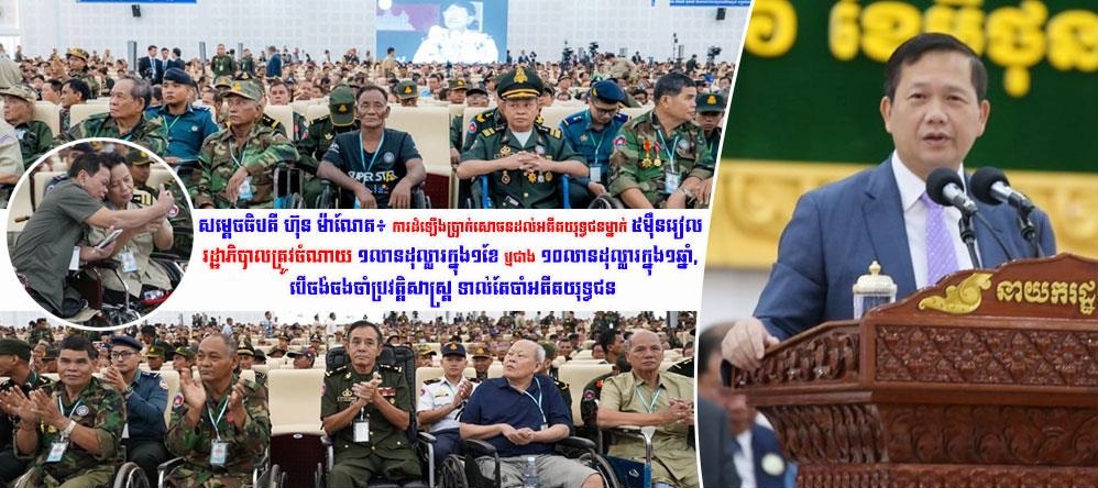 (ភ្នំពេញ)៖ សម្តេចធិបតី ហ៊ុន ម៉ាណែត នាយករដ្ឋមន្ត្រីនៃកម្ពុជា និងជាអនុប្រធានទី១ នៃសមាគមអតីតយុទ្ធជនកម្ពុជា បានថ្លែងបញ្ជាក់ថា រាជរដ្ឋាភិបាលកម្ពុជា បានគិតគូរជាប្រចាំនូវជីវភាពរស់នៅរបស់អតីតយុទ្ធជន តាមរយៈការដំឡើងប្រាក់សោធន ក៏ដូចជាការផ្តល់ជូនការឧបត្ថម្ភផ្សេងៗទៀត។ រាជរដ្ឋាភិបាលបានដំឡើងប្រាក់សោធនអប្បបរមា (ទាបបំផុត) ប្រចាំខែរបស់អតីតមន្ត្រីរាជការស៊ីវិល និងអតីតយុទ្ធជនពី ៧៧ ម៉ឺនរៀលនៅឆ្នាំ ២០២៣ ដល់ ៨២.៥ម៉ឺនរៀលនៅឆ្នាំ២០២៤។ សម្ដេចធិបតី ហ៊ុន ម៉ាណែត បានអះអាងថា ការដប្រាក់សោធនដល់អតីតយុទ្ធជនម្នាក់ ៥ម៉ឺនរៀល រាជរដ្ឋាភិបាលចំណាយ ១លានដុល្លារក្នុង ១ខែ ស្មើនឹងមួយឆ្នាំ១០លានដុល្លារ។ ការលើកឡើរបស់សម្តេចធិបតីធ្វើឡើង ក្នុងឱកាសអញ្ជើញជាអធិបតីភាពអបអរសាទរខួបលើកទី ១៧ ទិវាអតីតយុទ្ធជនកម្ពុជា