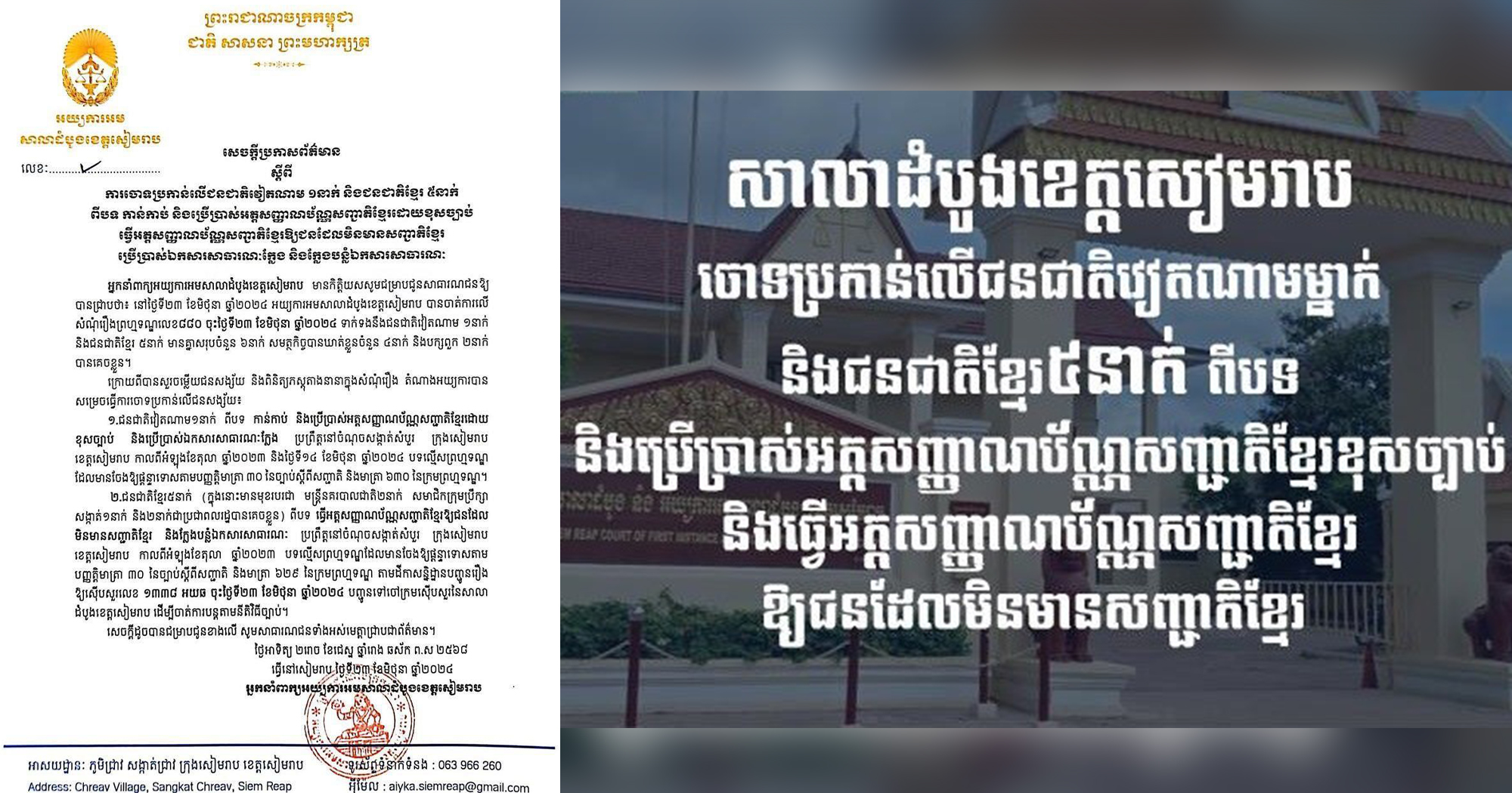 (សៀមរាប)៖ សាលាដំបូងខេត្តសៀមរាប បានធ្វើការចោទប្រកាន់លើជនជាតិវៀតណាមម្នាក់ និងជនជាតិខ្មែរ៥នាក់ ពីបទ កាន់កាប់ និងប្រើប្រាស់អត្តសញ្ញាណប័ណ្ណសញ្ជាតិខ្មែរដោយខុសច្បាប់ ធ្វើអត្តសញ្ញាណប័ណ្ណសញ្ជាតិខ្មែរឱ្យជនដែលមិនមានសញ្ជាតិខ្មែរ ប្រើប្រាស់ឯកសារសាធារណៈក្លែង និងក្លែងបន្លំឯកសារសាធារណៈ។ អ្នកនាំពាក្យអយ្យការអមសាលាដំបូងខេត្តសៀមរាប មានកិត្តិយសសូមជម្រាបជូនសាធារណជនឱ្យ បានជ្រាបថា នៅថ្ងៃទី២៣ ខែមិថុនា ឆ្នាំ២០២៤ អយ្យការអមសាលាដំបូងខេត្តសៀមរាប បានចាត់ការលើ សំណុំរឿងព្រហ្មទណ្ឌលេខ៨៨០ ចុះថ្ងៃទី២៣ ខែមិថុនា ឆ្នាំ២០២៤ ទាក់ទងនឹងជនជាតិវៀតណាមម្នាក់ និងជនជាតិខ្មែរ ៥នាក់ មានគ្នាសរុបចំនួន៦នាក់ សមត្ថកិច្ចបានឃាត់ខ្លួនចំនួន ៤នាក់ និងបក្ខពួក២នាក់បានគេចខ្លួន។ ក្រោយពីបានសួរចម្លើយជនសង្ស័យ និងពិនិត្យភស្តុតាងនានាក្នុងសំណុំរឿង តំណាងអយ្យការបាន សម្រេចធ្វើការចោទប្រកាន់លើជនសង្ស័យ៖ *ទី១៖ ជនជាតិវៀតណាមម្នាក់