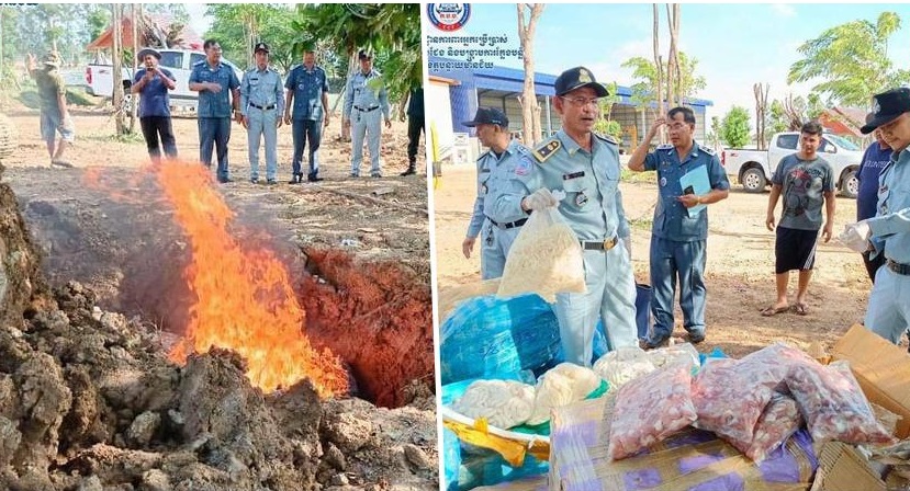 (បន្ទាយមានជ័យ)៖ សមត្ថកិច្ចចម្រុះមកពីនាយកដ្ឋានការពារអ្នកប្រើប្រាស់ កិច្ចការប្រកួតប្រជែង និងបង្ក្រាបការក្លែងបន្លំ (ក.ប.ប.) ខេត្តបន្ទាយមានជ័យ សហការជាមួយមន្ត្រីសាខាគយ បានចុះចាប់រថយន្ត ១គ្រឿងបង្កប់សាច់បង្កកចម្រុះដែលមានសារធាតុគីមីជាង១តោន។ ការបង្ក្រាបសាច់បង្កកនេះបាននៅ វេលាម៉ោង ៥ល្ងាចថ្ងៃទី១៥ ខែមិថុនា ឆ្នាំ២០២៤ ក្នុងចំណុចសាលាក្រហម ស្ថិតនៅភូមិសូរិយាថ្មី ឃុំកូប ស្រុកអូរជ្រៅ។ បើតាមការអះអាងពីមន្ត្រីចម្រុះ បានប្រាប់ភ្នាក់ងារព័ត៌មាន Fresh News ថា ផលិតផលទាំងអស់នេះ ត្រូវបានឈ្មួញដឹកចេញពីប្រទេសថៃ លួចដឹកចូលមកប្រទេសកម្ពុជា តាមច្រកតាមច្រករបៀង ពុំមានឯកសារយោង និងលិខិតអនុញាតពីជំនាញផលិតកម្ម និងបសុព្យាបាល និងជំនាញជលផលនៃក្រសួងកសិកម្មរុក្ខាប្រមាញ់ និងនេសាទចេញឱ្យទេ។ ផលិតផលទាំងនោះ ភាគច្រើនបានខូចគុណភាពអស់ហើយ ព្រោះតែរក្សាទុកក្នុងសីតុណ្ហភាព